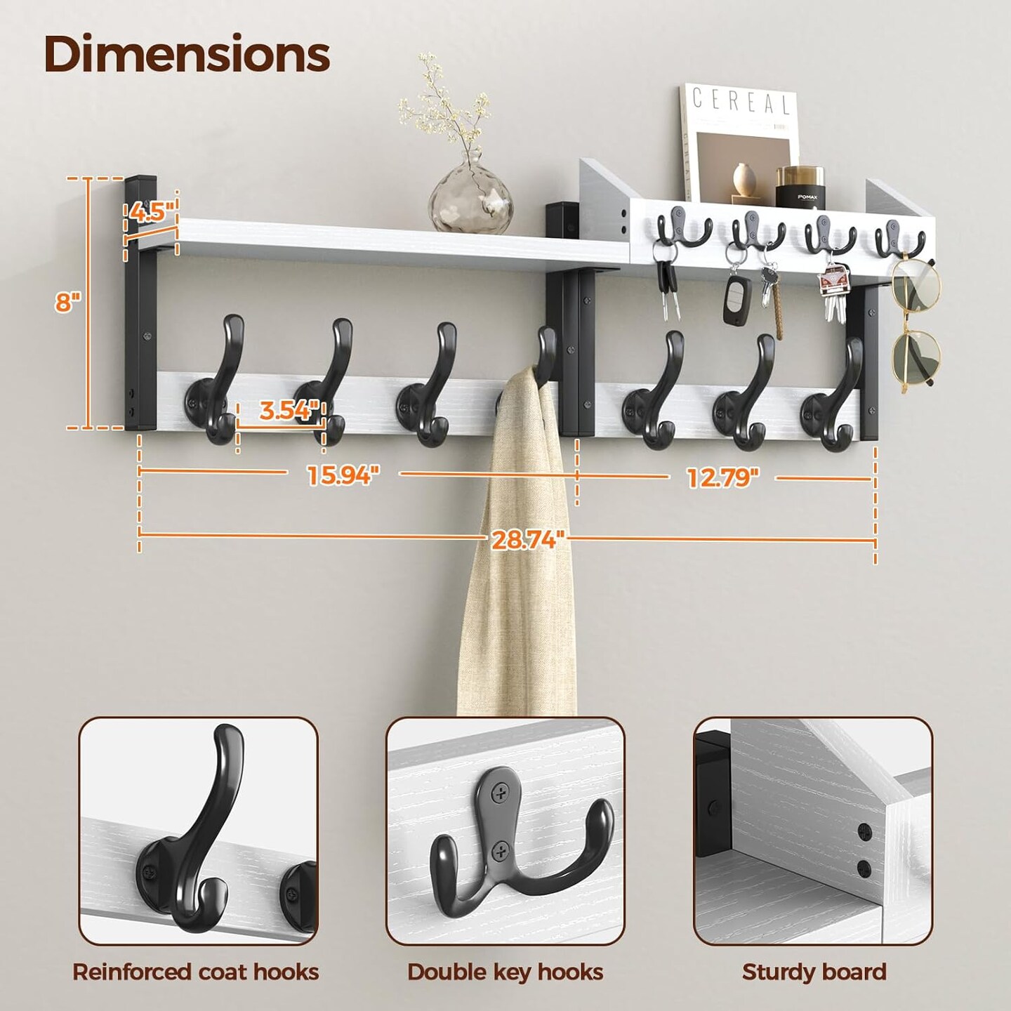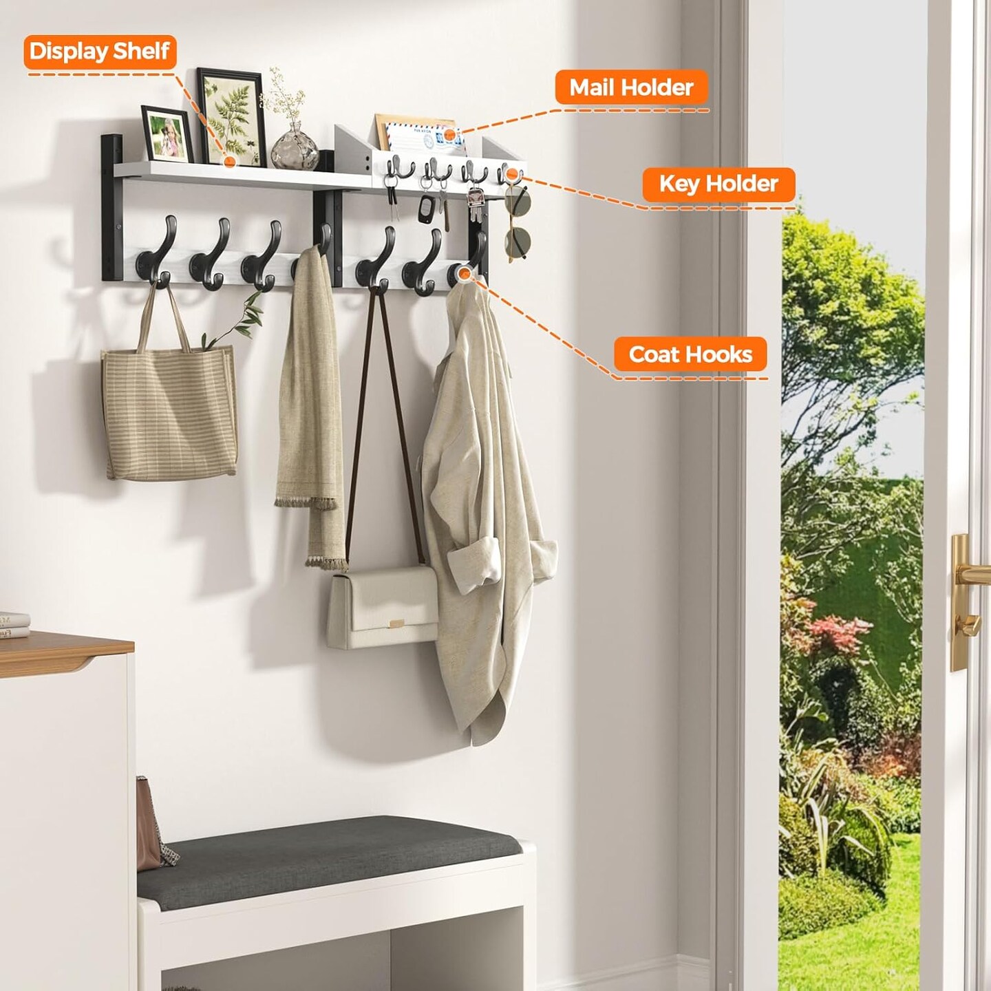 29" Coat Rack Wall Mount with Shelf, 4 in 1 Coat and Key Hanger with 11 Metal Hooks, Entryway Wall Mounted Shelf with Mail Holder for Living Room, Bedroom, White