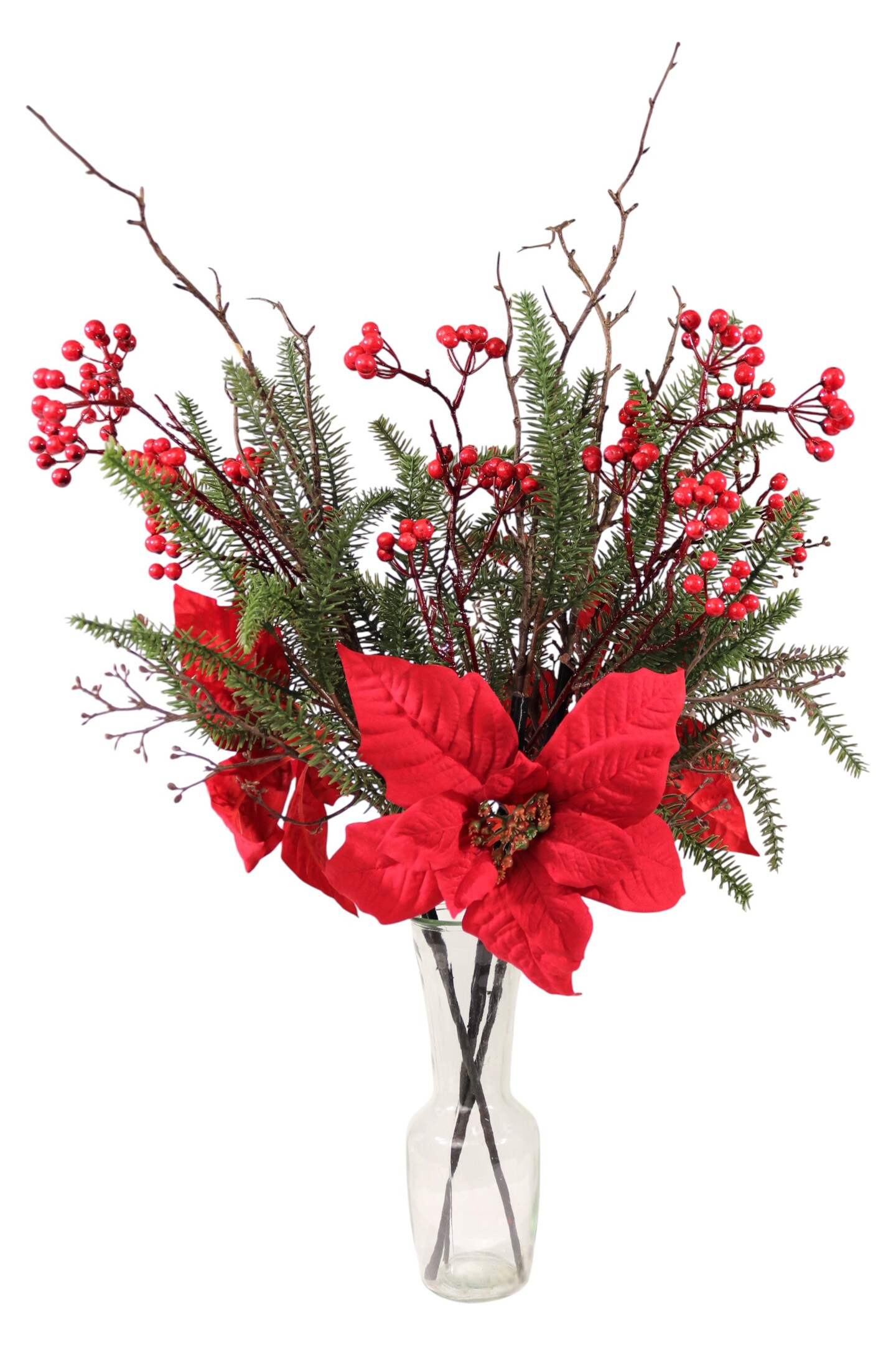 29" Poinsettia, Pine & Berry Spray – Red Artificial Holiday Floral Stem 6 Pack