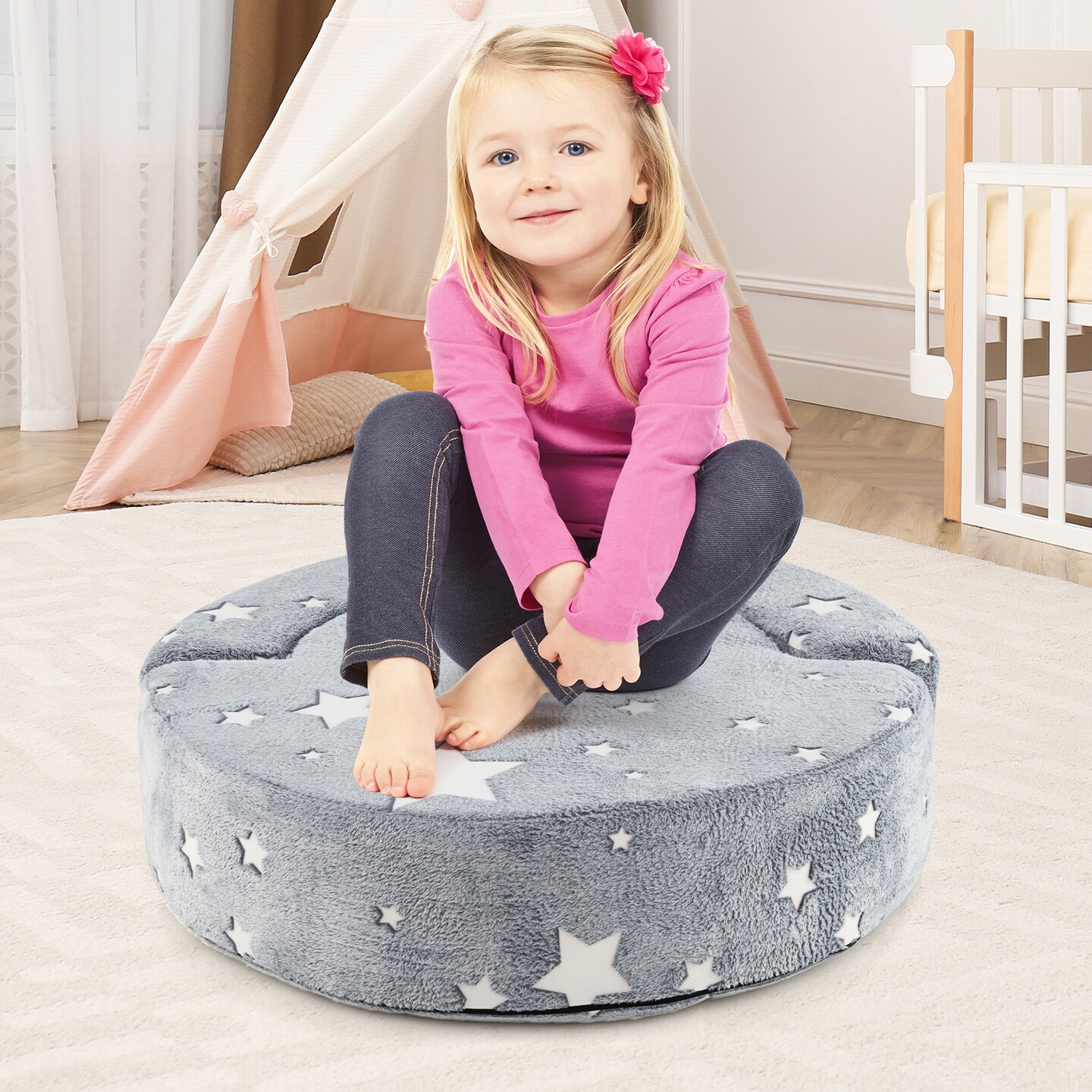 2-in-1 Grey 2-in-1 Convertible Design Kids Sofa with Flannel Fabric Cover and Luminous Star Patterns