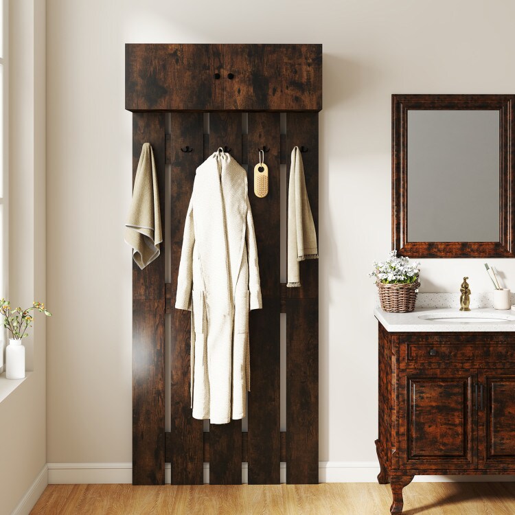 2-in-1 Wooden Wall Coat Rack with Storage Cabinet and Hooks for Living Room and Hallway