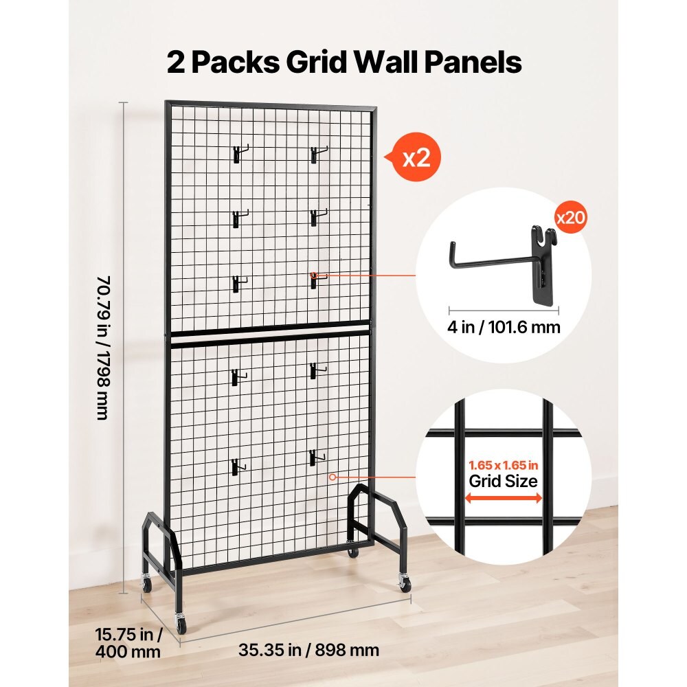 2-Pack Black Metal Grid Wall Organizer with Casters Heavy Duty Steel Panel for Retail or Home