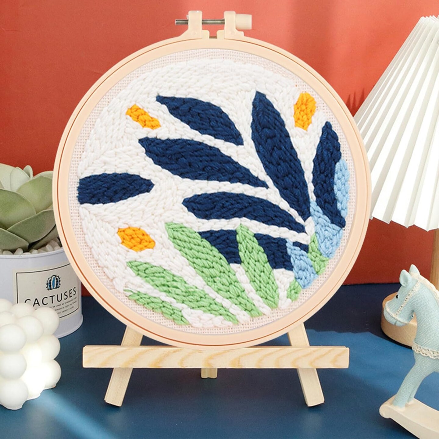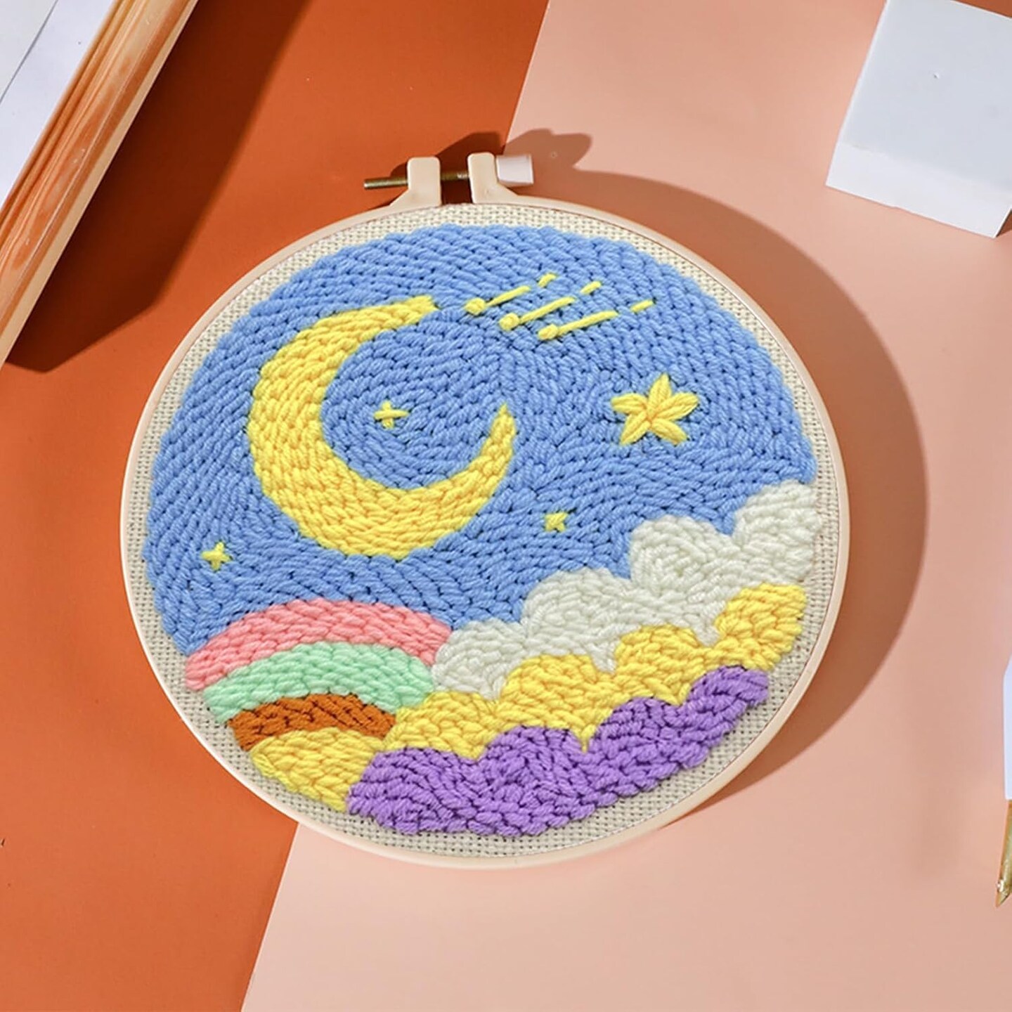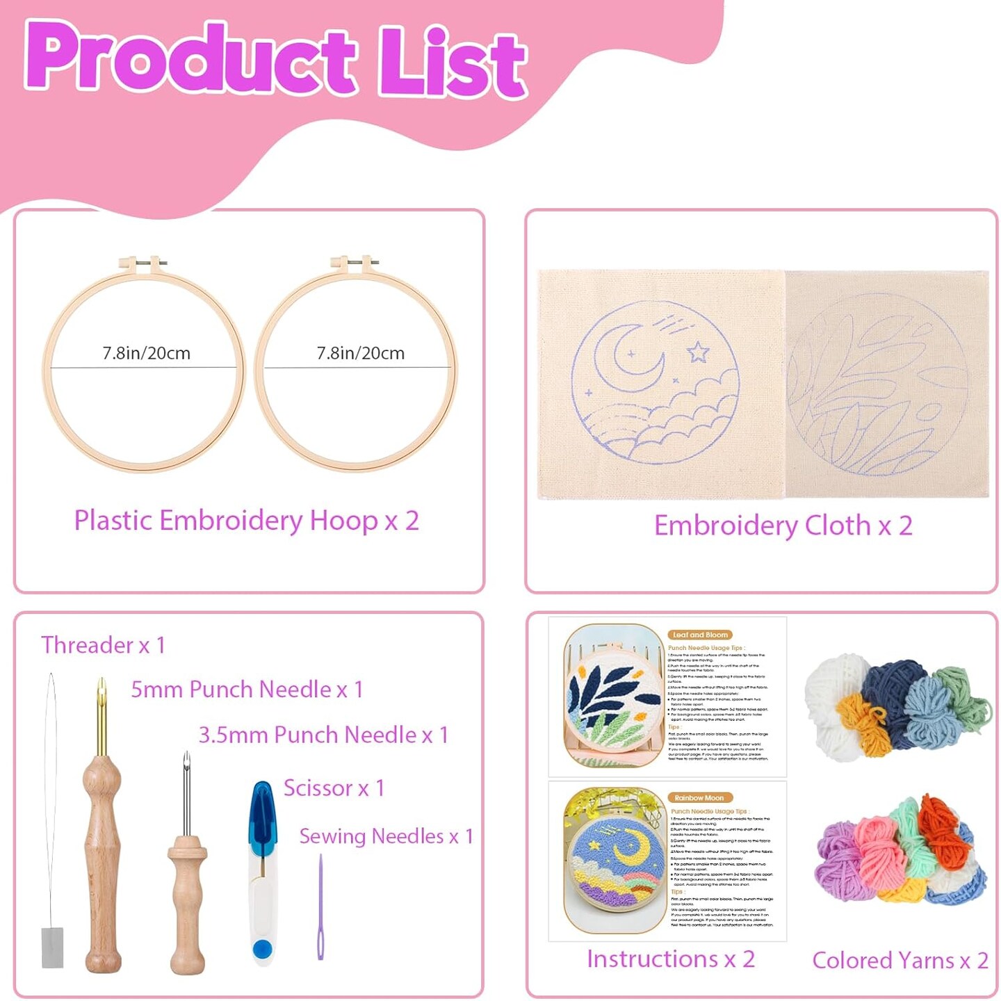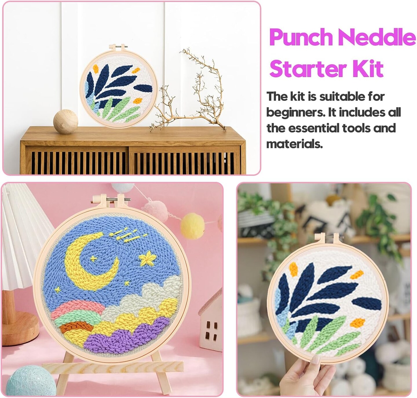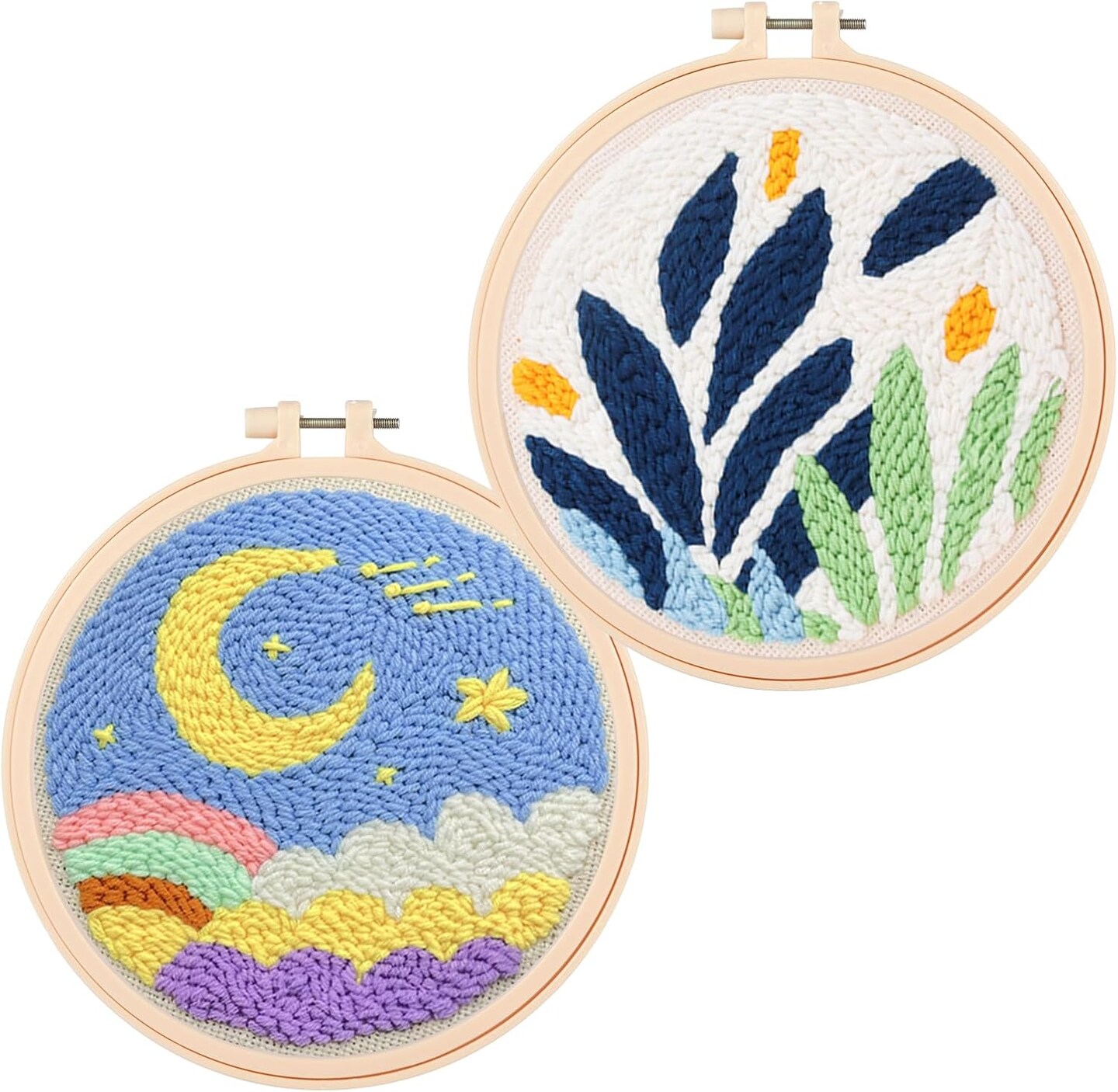 2-Pack Punch Needle Kits – Moon & Leaf Embroidery Starter Set with 5mm/3.5mm Needles, Hoops, Yarn & Pre-Printed Fabric for Beginners DIY Craft & Home Décor