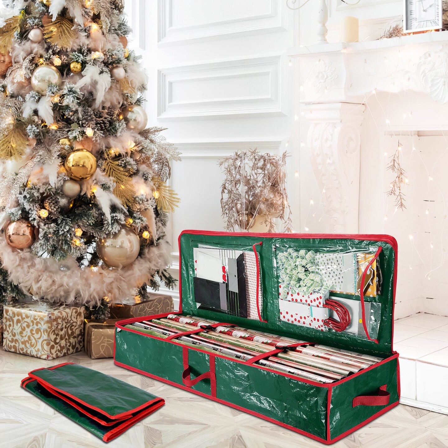 2Pcs Christmas Wrapping Paper Storage Containers Foldable Organizer with Pockets and Handles