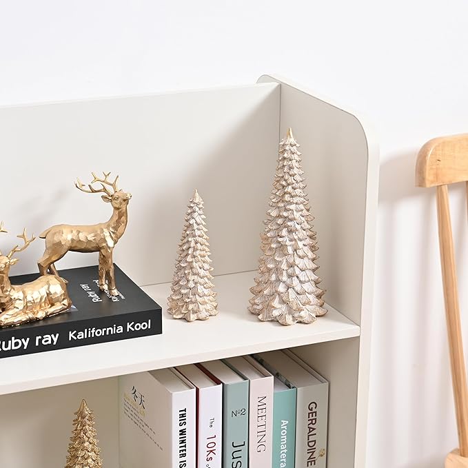 2Pcs Distressed White with Gold Table top Christmas Trees, Small Christmas Tree Figurine Set, Decorative Xmas Trees for Rustic Christmas Decor