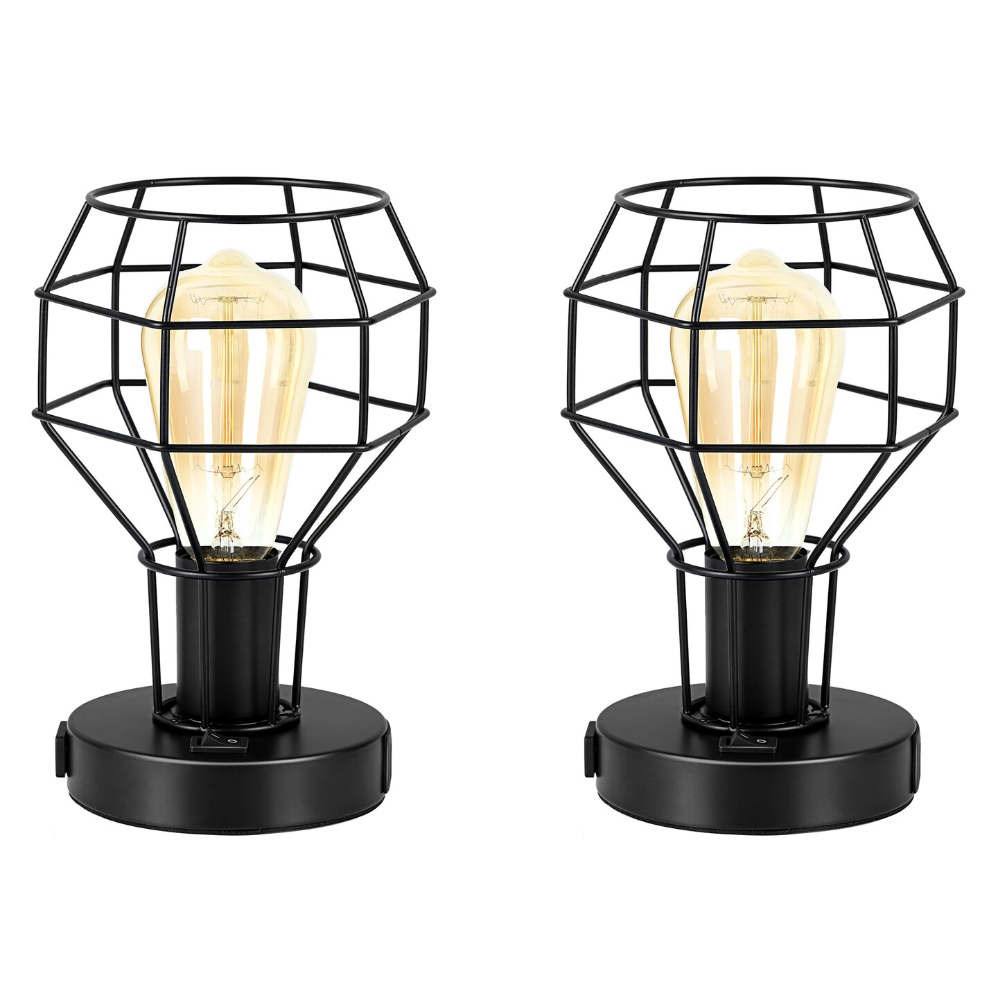 2PCS Industrial Steampunk Table Lamp Vintage Cage Bedside Light with Dual USB Ports & AC Outlet UL-Certified, Portable Nightstand Lamp for Small Spaces