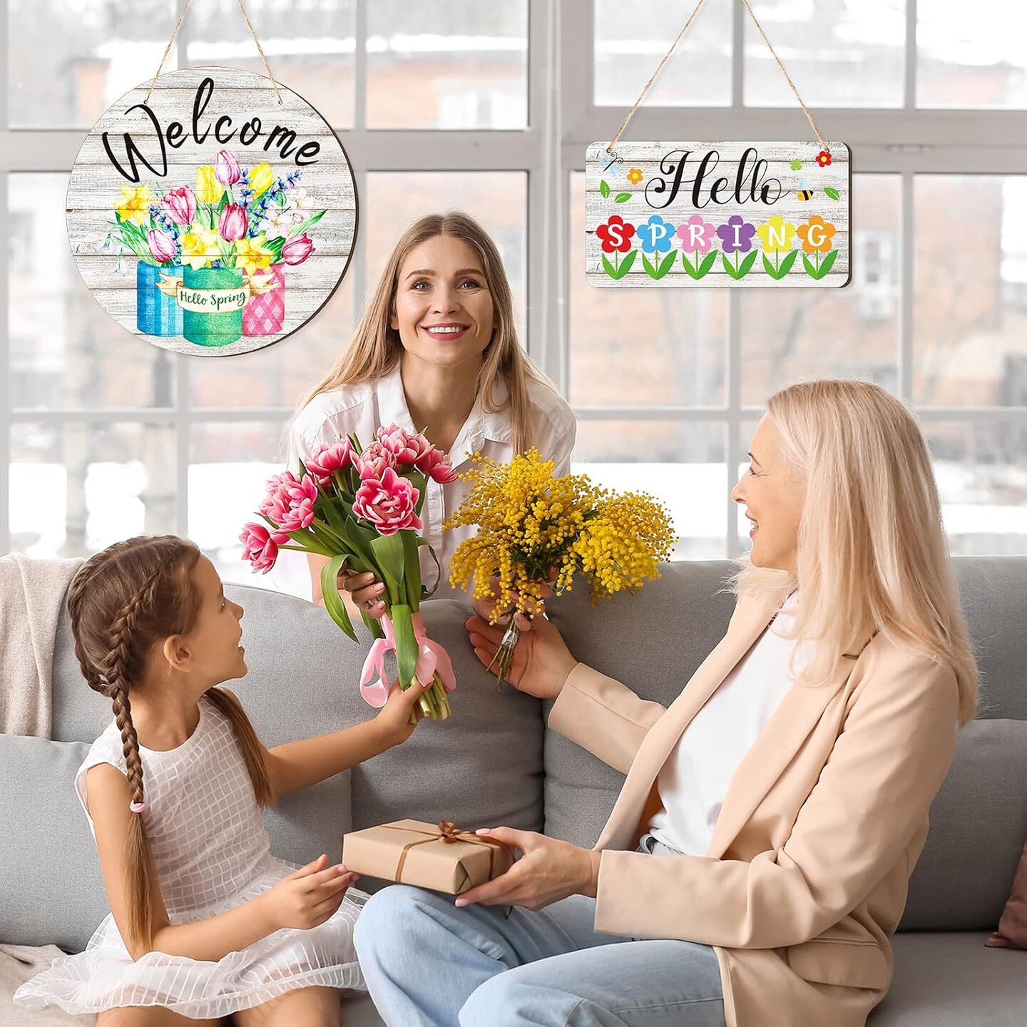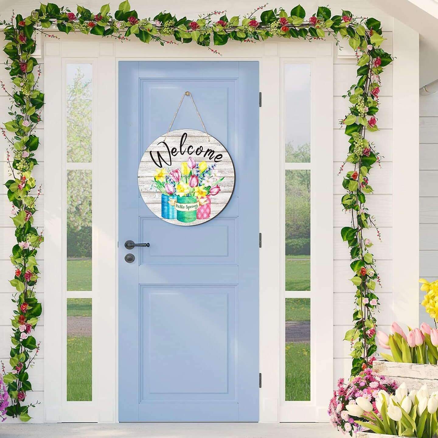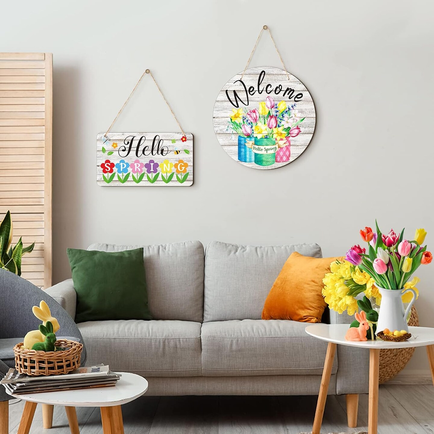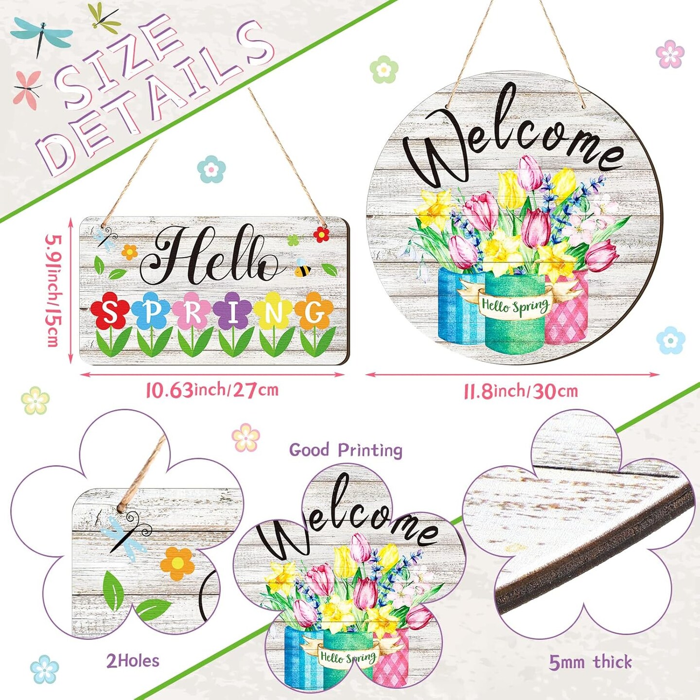 2-Piece “Hello Spring” Rustic Wood Signs – Front Door & Wall Hanging Decor with Flowers for Home, Indoor & Outdoor