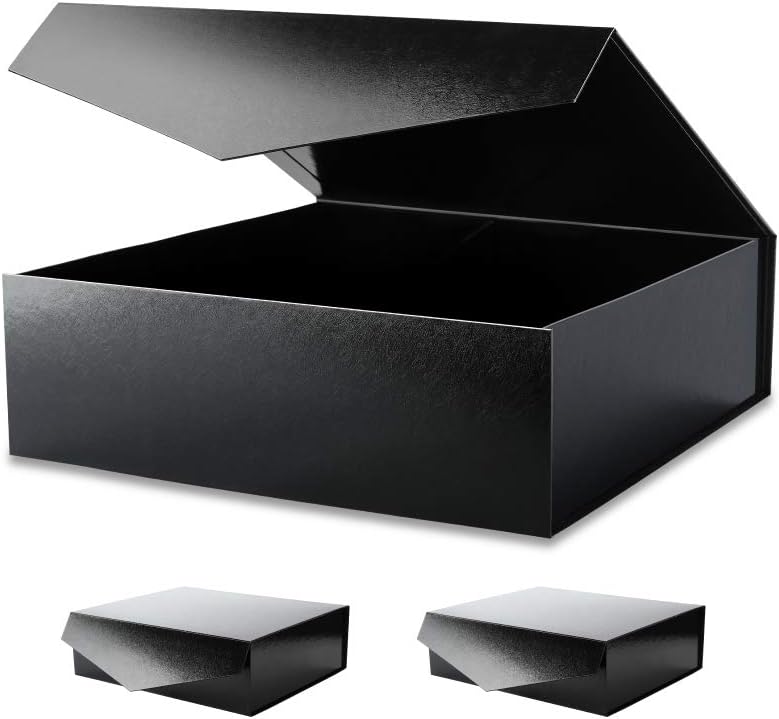 3 Extra Large Black Gift Boxes with Lids, 16.3 x 14.2 x 5 Inches – Glossy Black with Grass Texture for Clothes, Large Gifts, and Special Occasions
