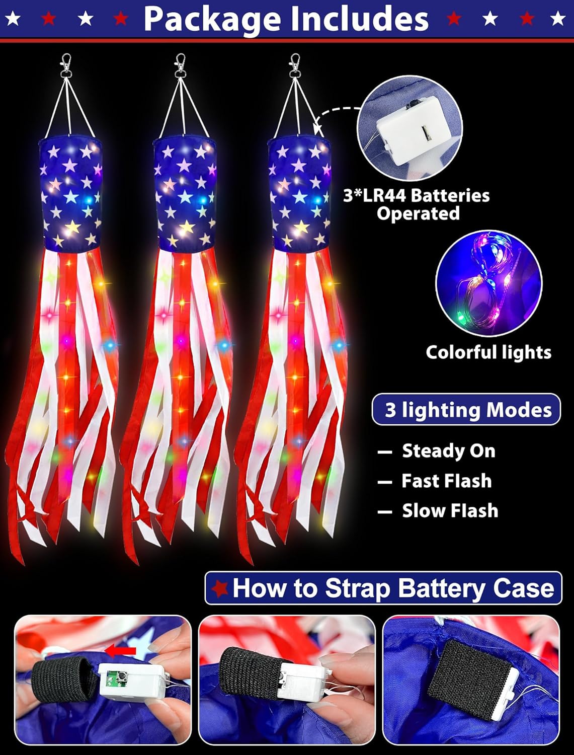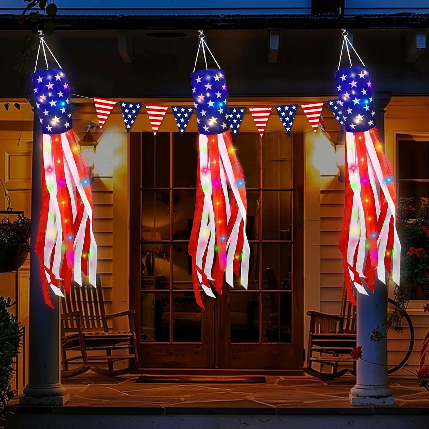 3 Pack 40" American Flag Windsock with Lights 4th of July Decorations