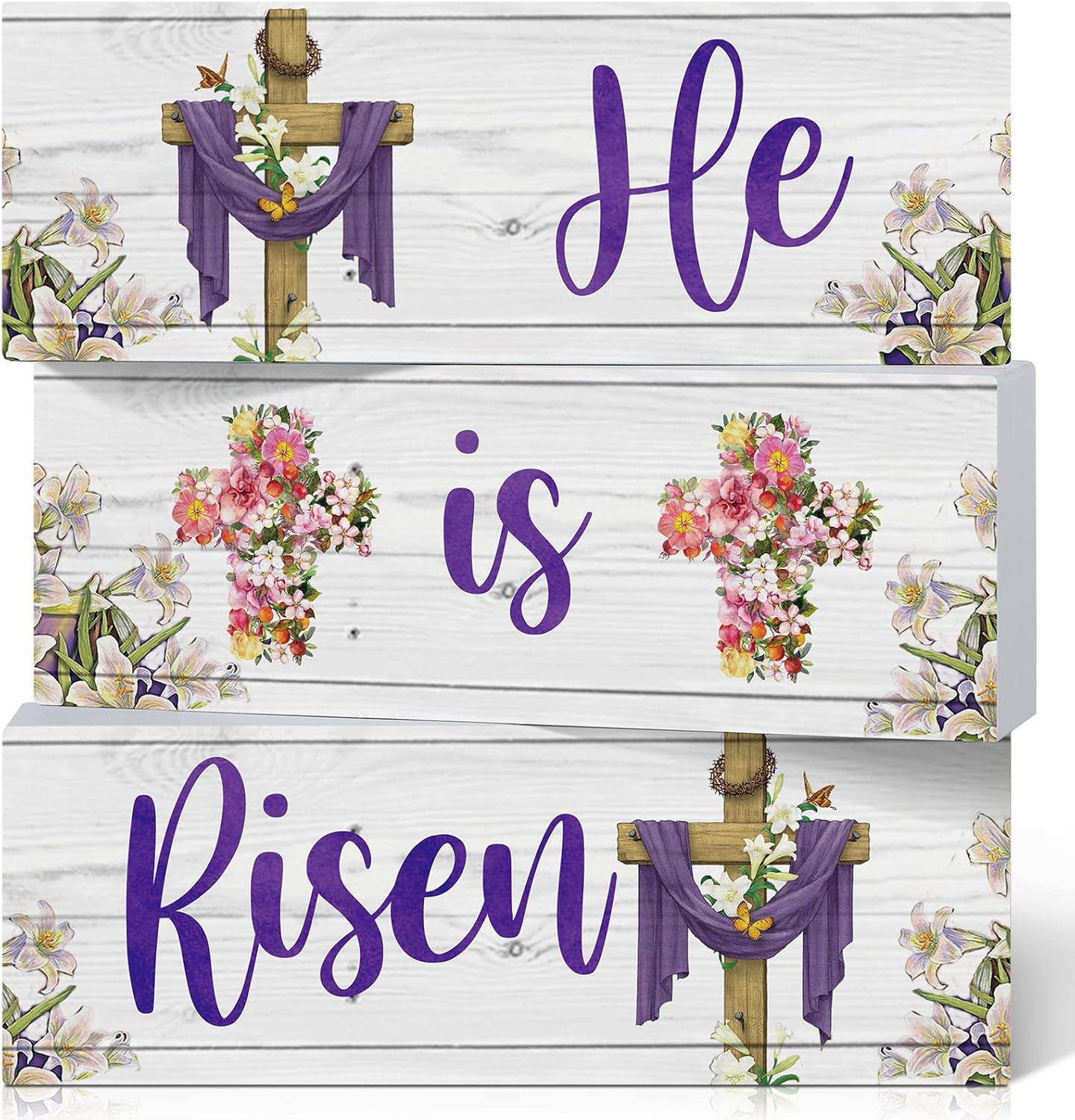 3 Pack Easter Wooden Table Decorations Easter Wood He is Risen Table Sign Sets Floral Cross Easter Tiered Tray Decor Religious Tabletop Centerpieces for Easter Spring Home Office