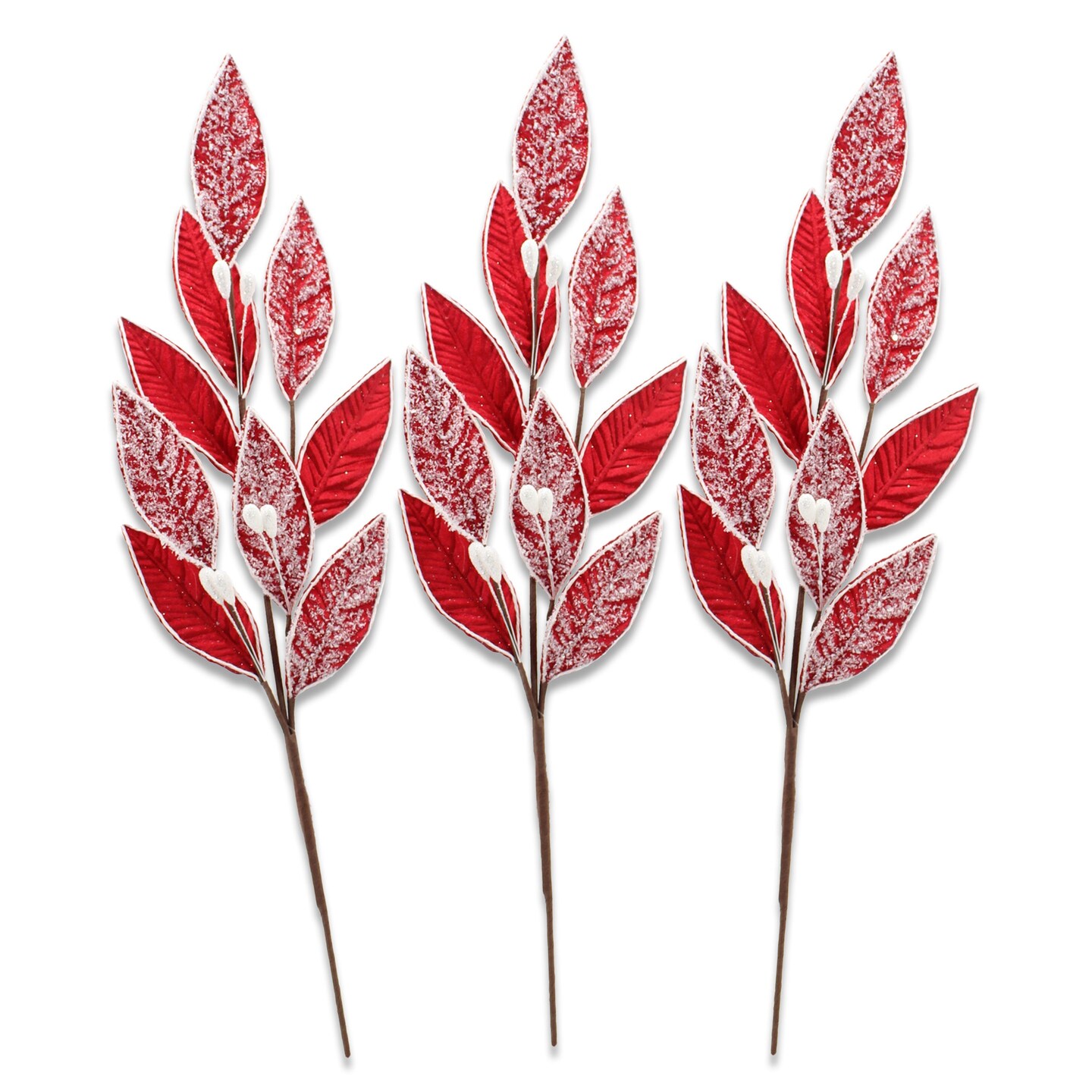 3 Pack of Red Leafy Picks with Silver Glitter Accents
