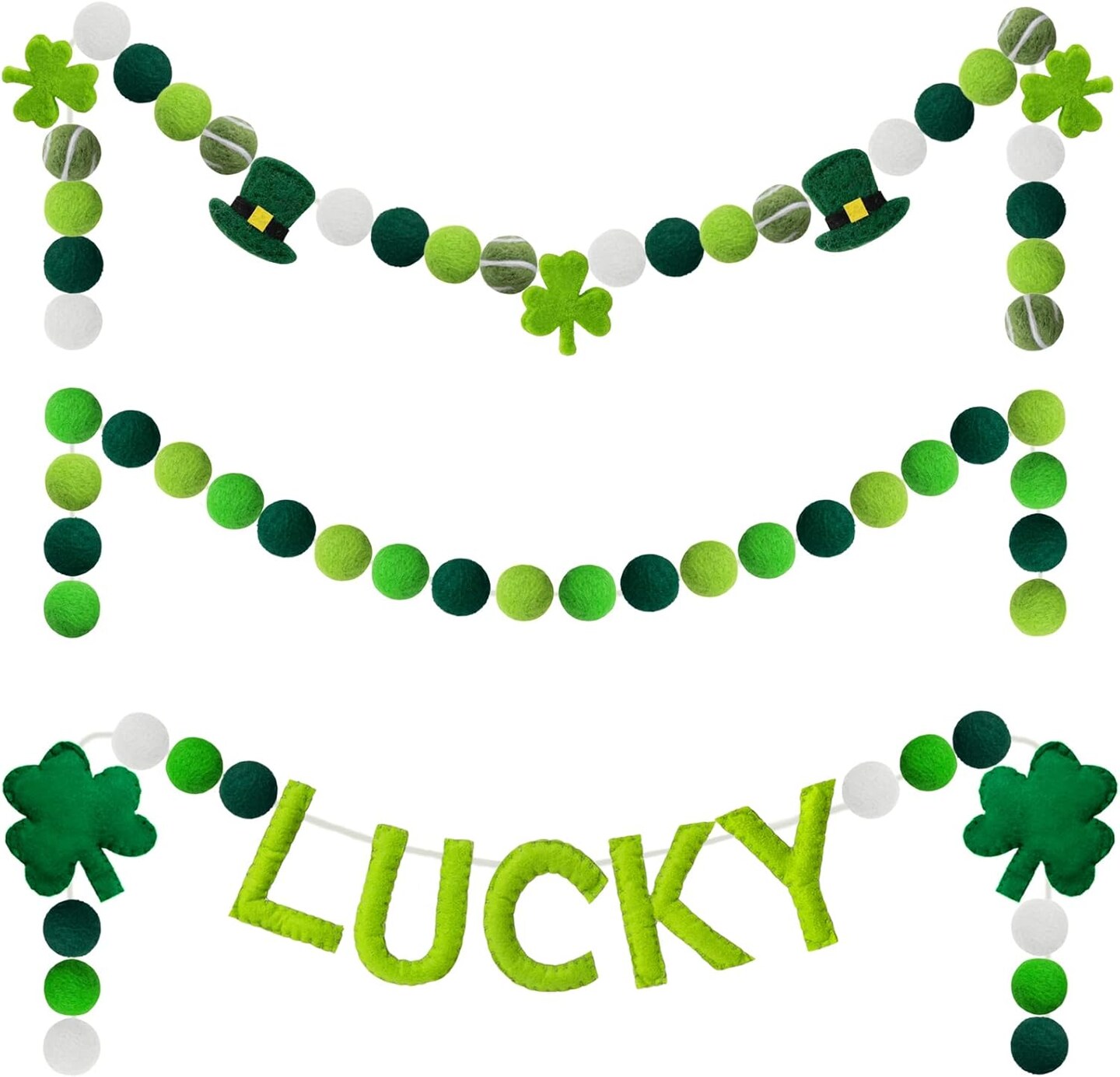 3 Pack St. Patrick's Day Felt Ball Garlands, 6.6 FT Lucky Pom Pom Shamrock Garlands, Green Felt Ball Garlands Banner, Irish Themed Party Favors for St. Patrick's Day Mantle Home Supplies Decorations