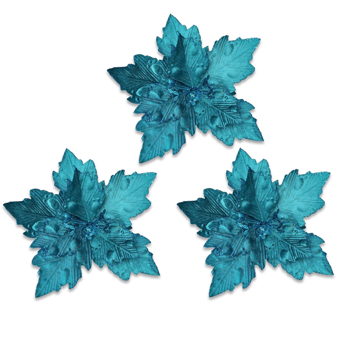 3 Pack Teal Blue Poinsettia Picks with Glitter Centers