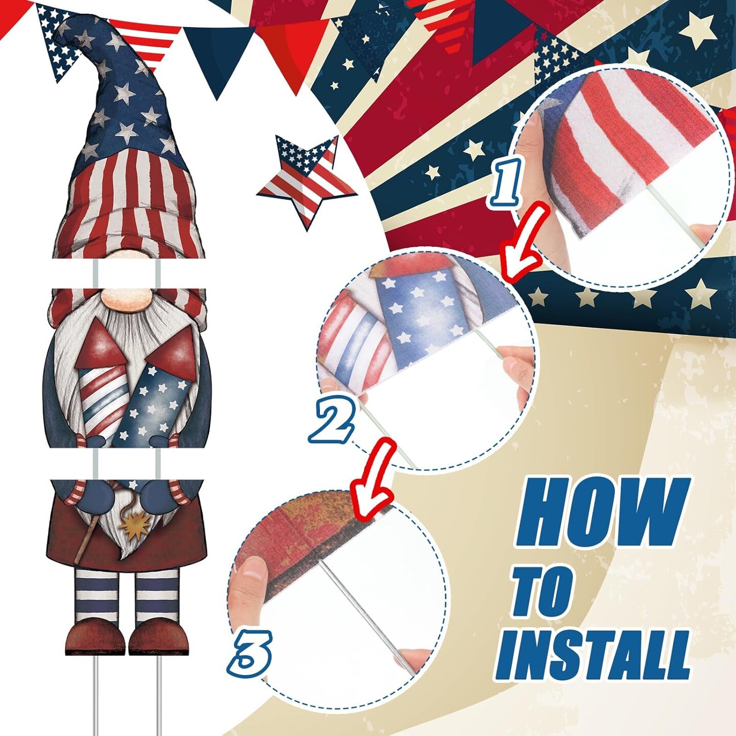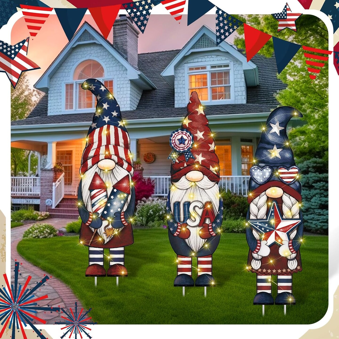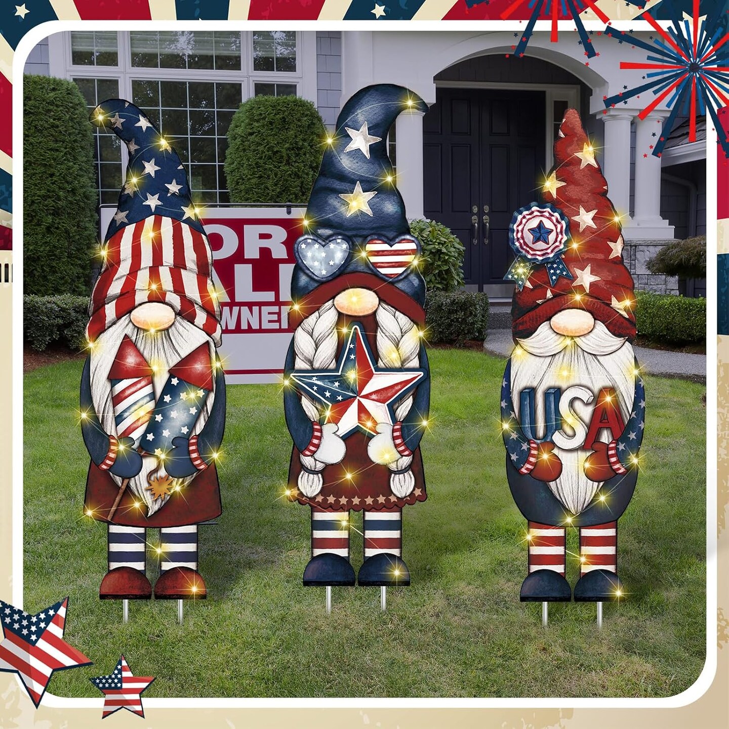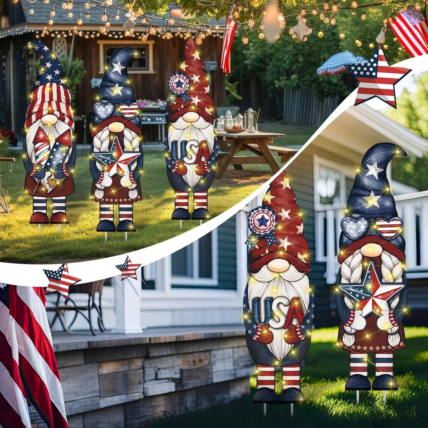 3 Pcs 4th of July Gnome Yard Signs Large Lighted Patriotic Outdoor Decoration Vintage LED Memorial Day Outside Decoration Independence Day Yard Sign with Stake for Lawn Garden Supplies