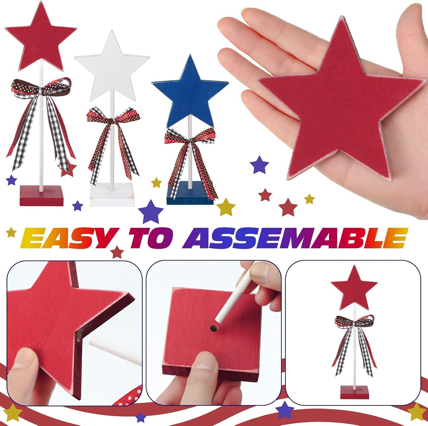 3 Pcs 4th of July Stars Tabletop Decoration Patriotic Centerpieces Wooden Standing Star Block
