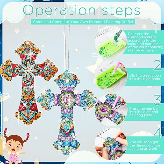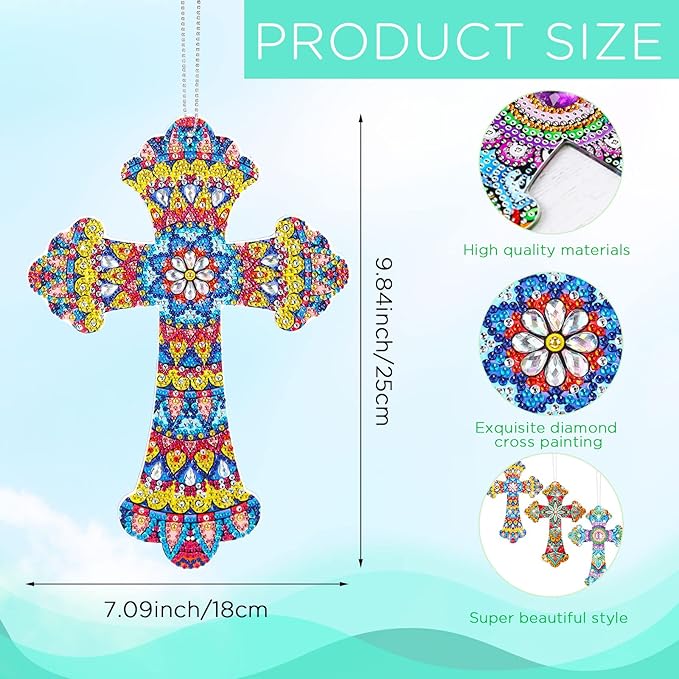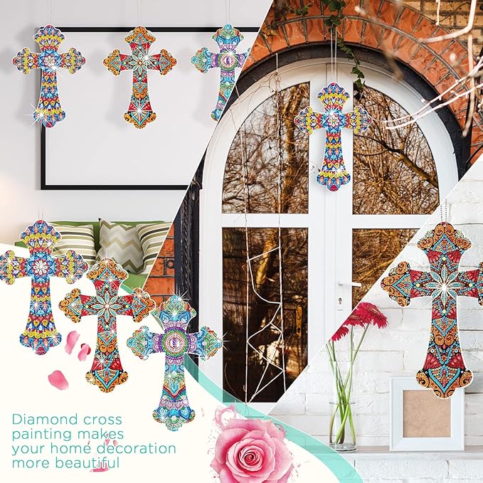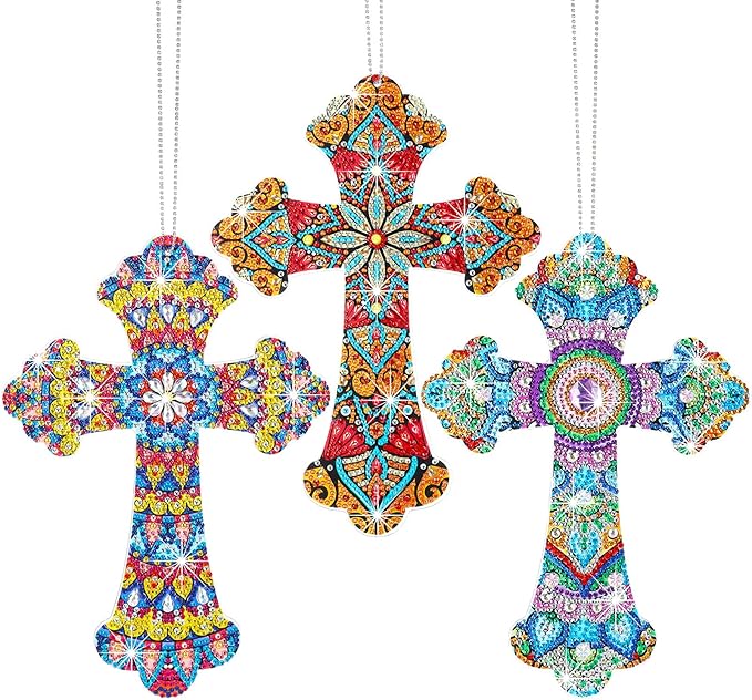 3 Pcs Cross Diamond Art Painting Hanging Kit for Adult DIY 5d Crystal by Number Mandala Cross Rhinestone Pendant Acrylic Mosaic Wall Ornament Gift for Valentine Easter Religious Christians