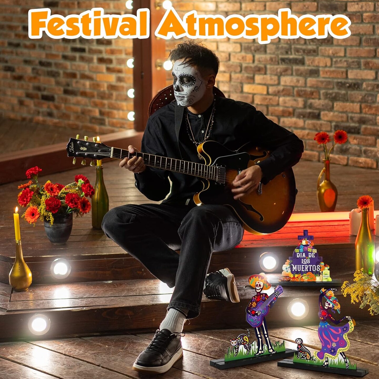 3 Pcs Day of The Dead Centerpiece Wooden Sugar Skull Signs Dancing Skeleton Couple Statue