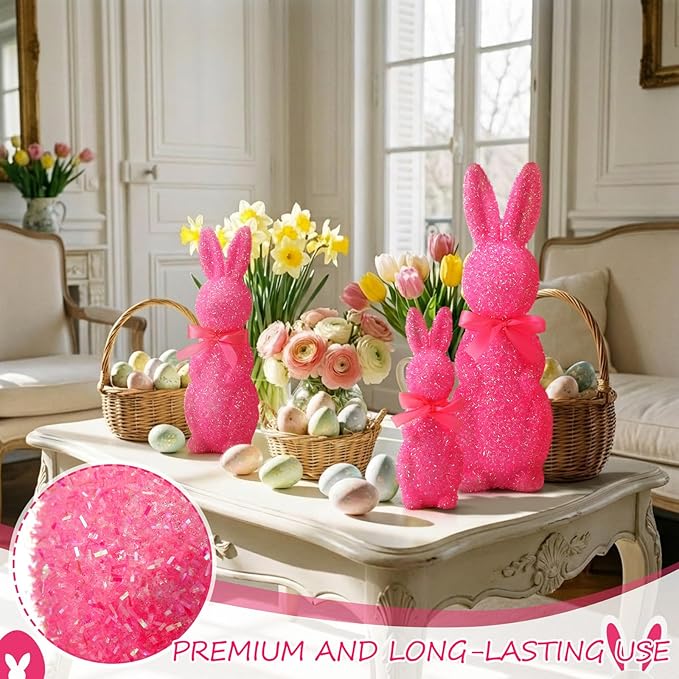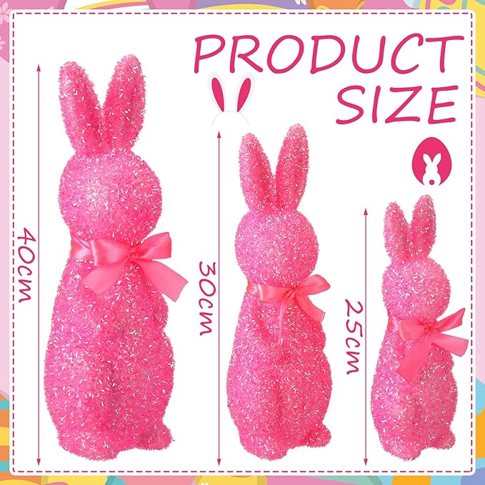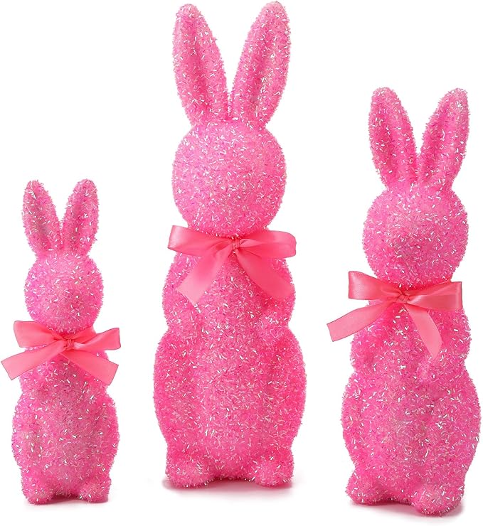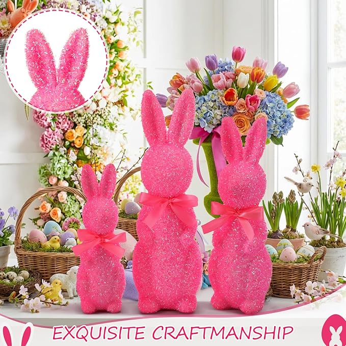 3 Pcs Easter Bunny Decorations Pink Flocked Bunny Figurines with Bow Flocking Rabbit Tabletop Statues for Spring Easter Farmhouse Table Baskets Mantel Home Decor Gift 10 13 15.5 Inch