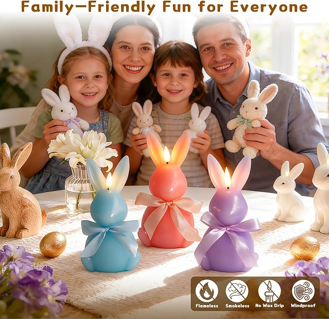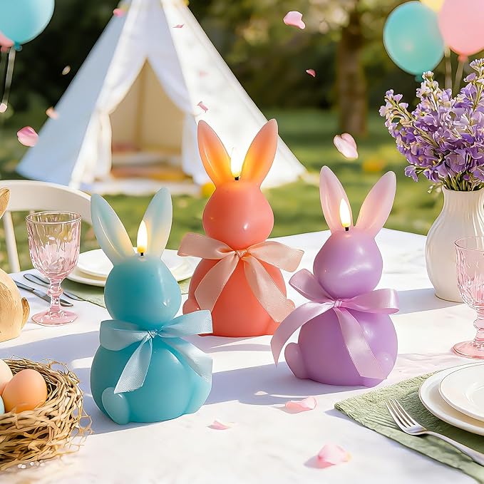 3 Pcs Easter Bunny Flameless Candles, Battery Operated Led Candle Light with Remote, Real Wax Rabbit Shaped Candle Gift Set, 3D Flickering Flame, NO Batteries Included, 7.3"x4"