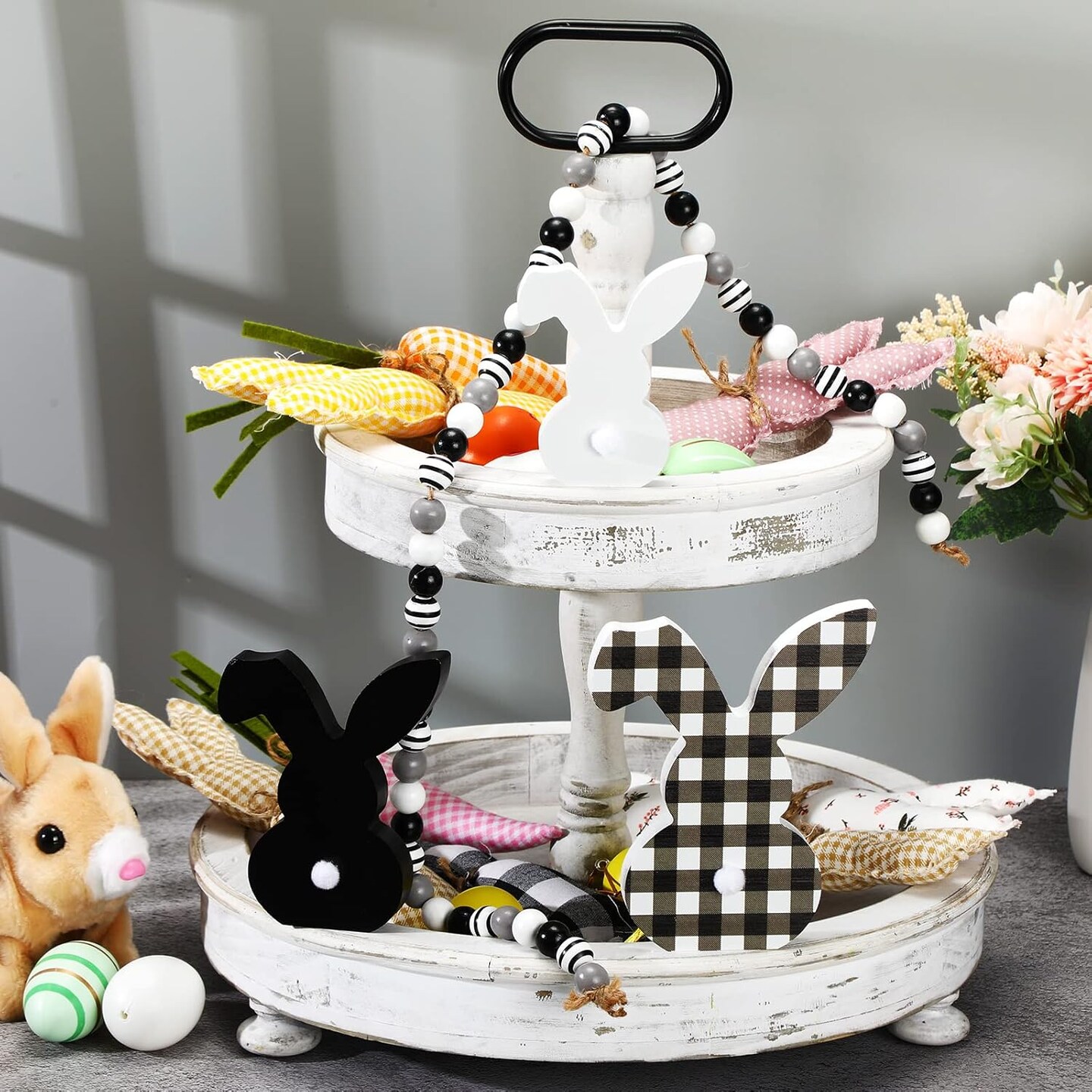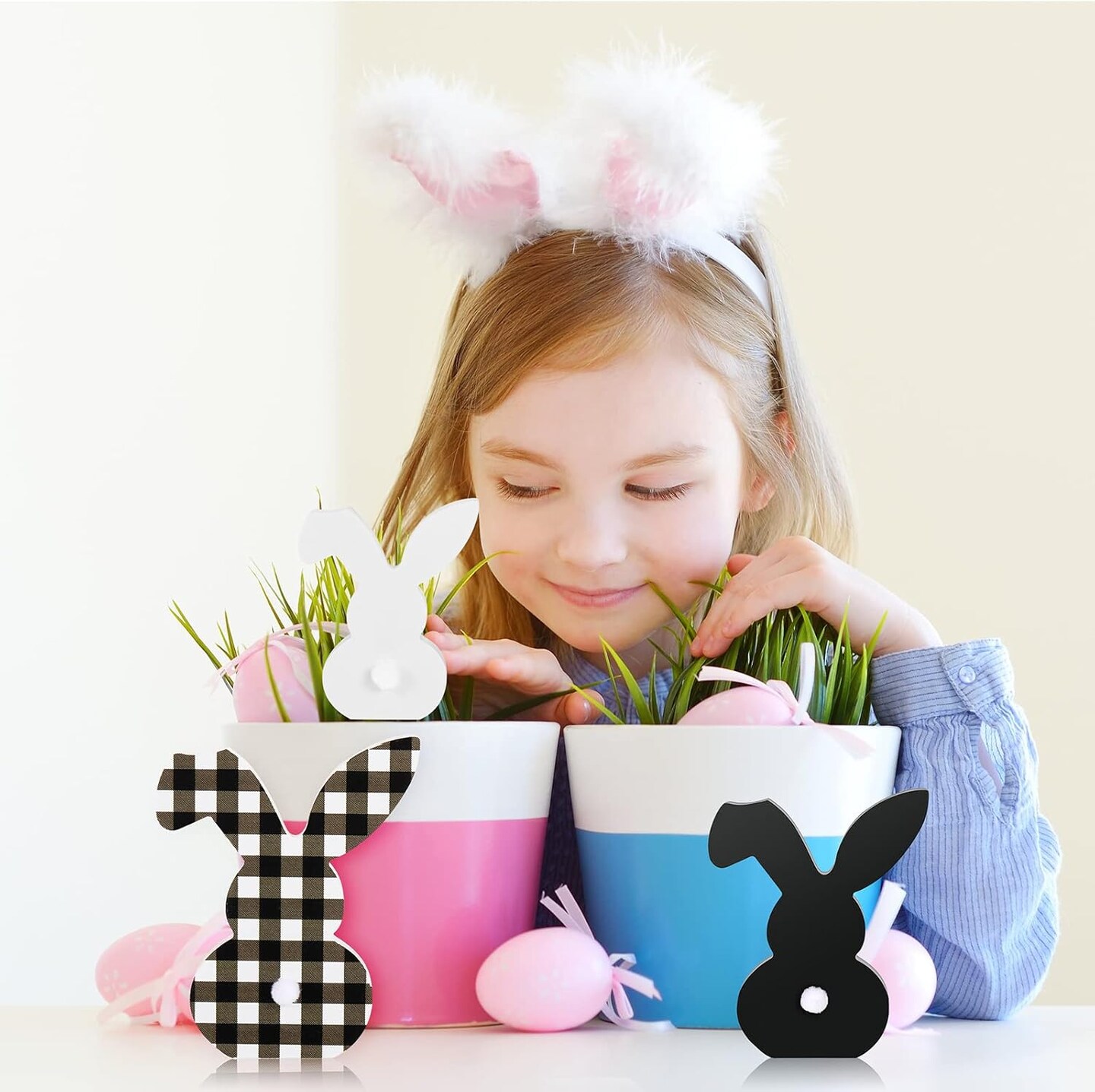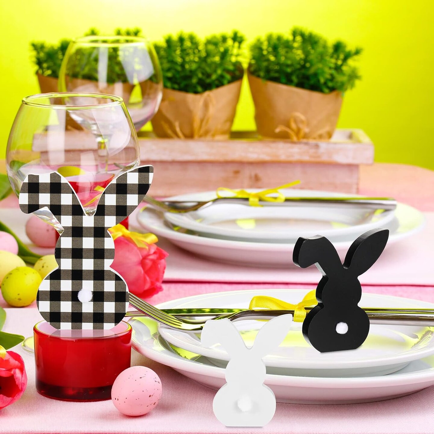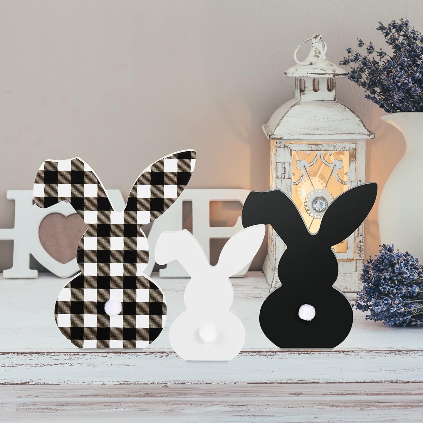 3 pcs Easter Bunny Table Wooden Signs Decor Spring Farmhouse Wood Bunnies Buffalo Plaid Bunny Cute Easter Craft Freestanding Centerpiece Signs for Kids Happy Easter Party Supplies Dining Room Table