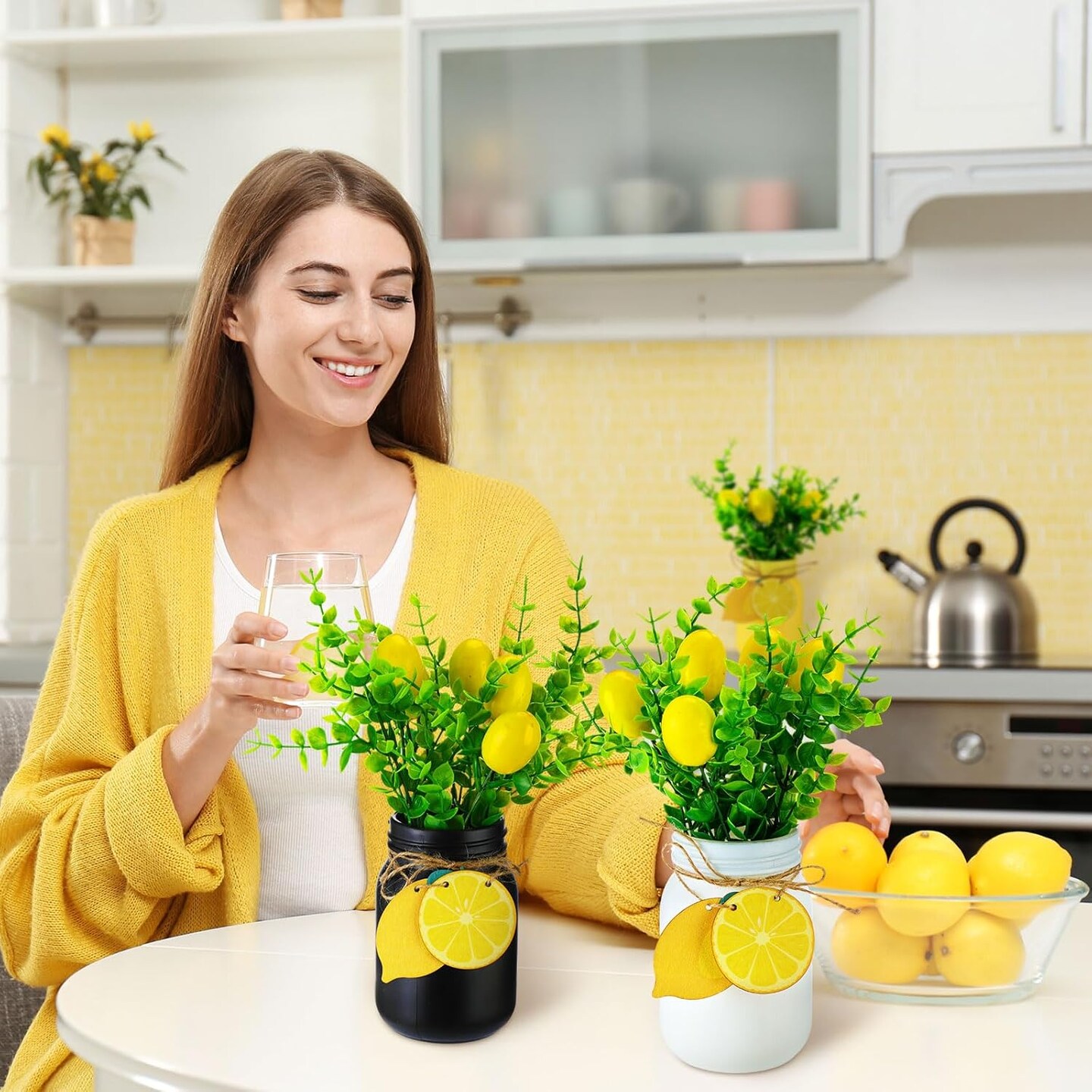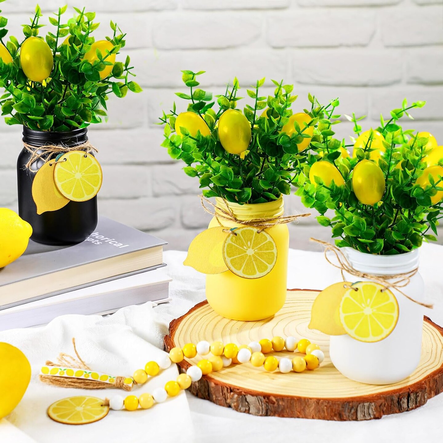 3 Pcs Lemon Kitchen Decor and Accessories Summer Farmhouse Mason Jar Table Centerpieces with Fake Plants Wooden Lemon Sign Garland Wooden Bead Twine for Tiered Tray Decor for Table Home
