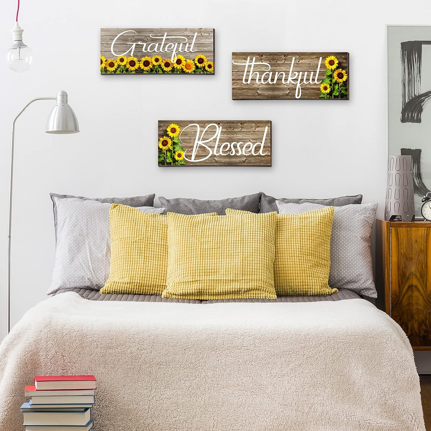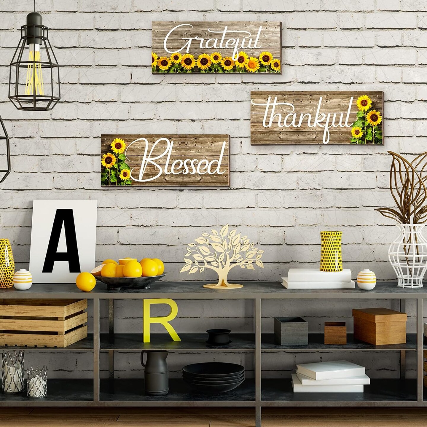 3 Pcs Sunflower Wall Decor Art Signs Wooden Hanging Wall Plaques Sunflowers Prints Decor for Thanksgiving Bathroom Bedroom Kitchen(10 x 4 x 0.2 Inch,White Words)