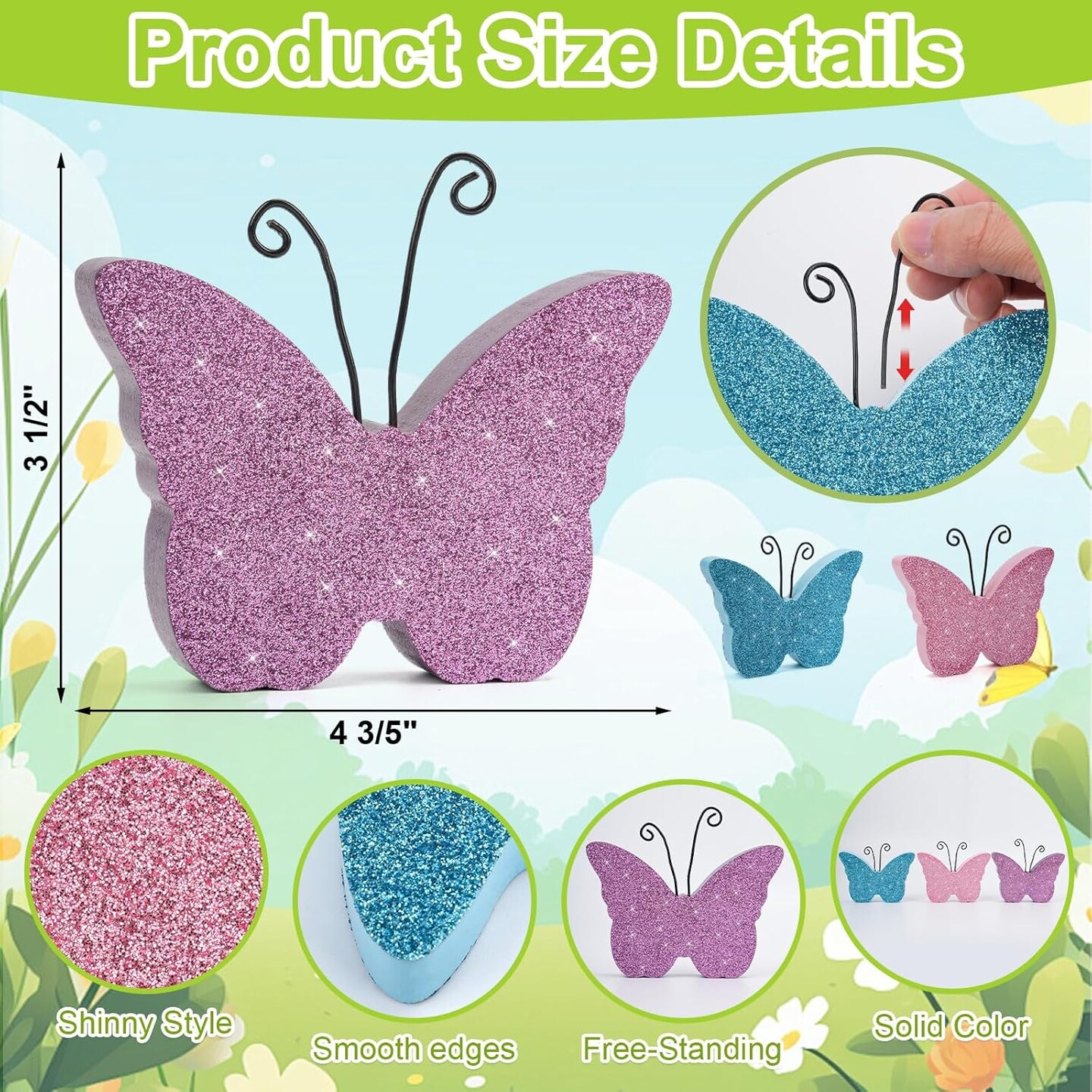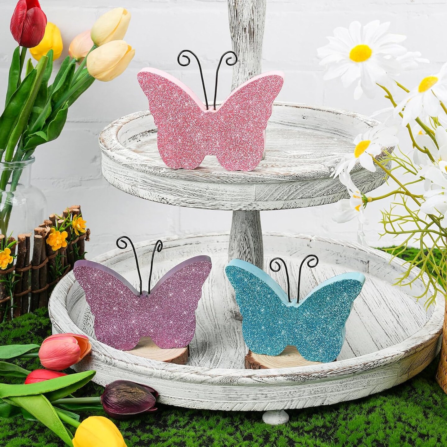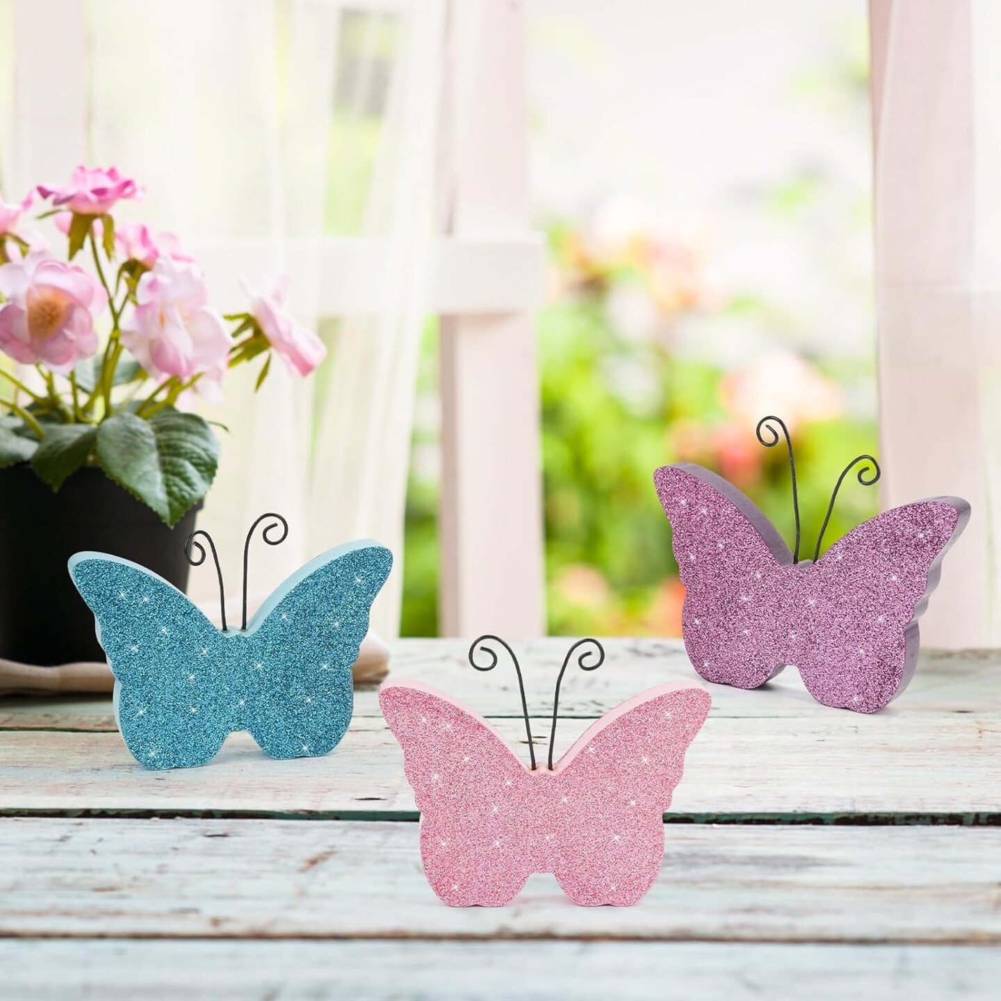 3 pcs Wooden Butterfly Blocks – Pink & Blue Glitter Spring Tabletop Decor