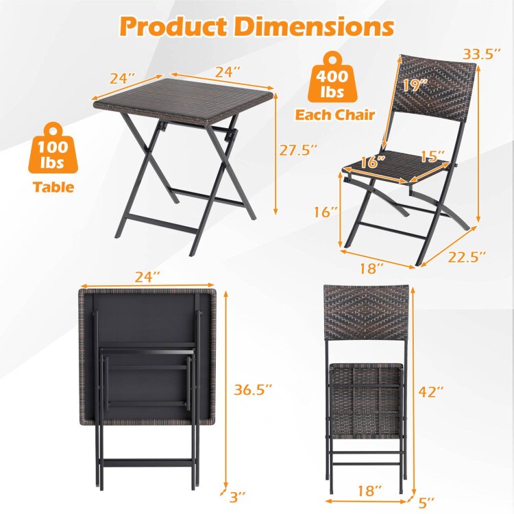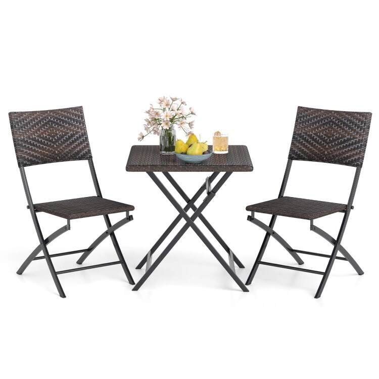 3 Piece Rattan Bistro Set Outdoor Folding Dining Table and Chairs with Wicker Seat