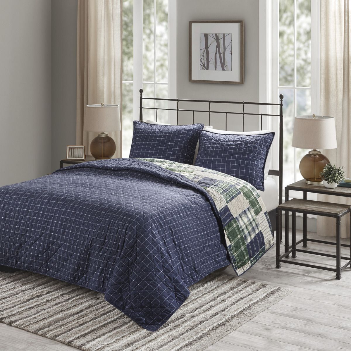3 Piece Reversible Printed Quilt Set King/Cal King Green/Navy