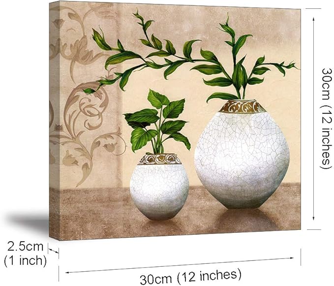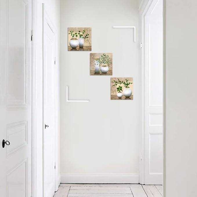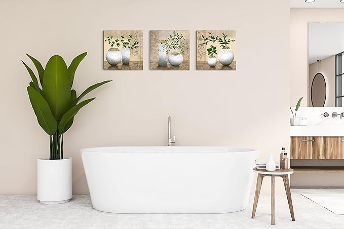 3 Piece Wall Art for Bathroom/Hallway, SZ HD Elegant Canvas Painting Prints of Green Spring Plants in Vases on Beige/Tan Picture (Waterproof Decor, Ready to Hang, 12x12 x3)