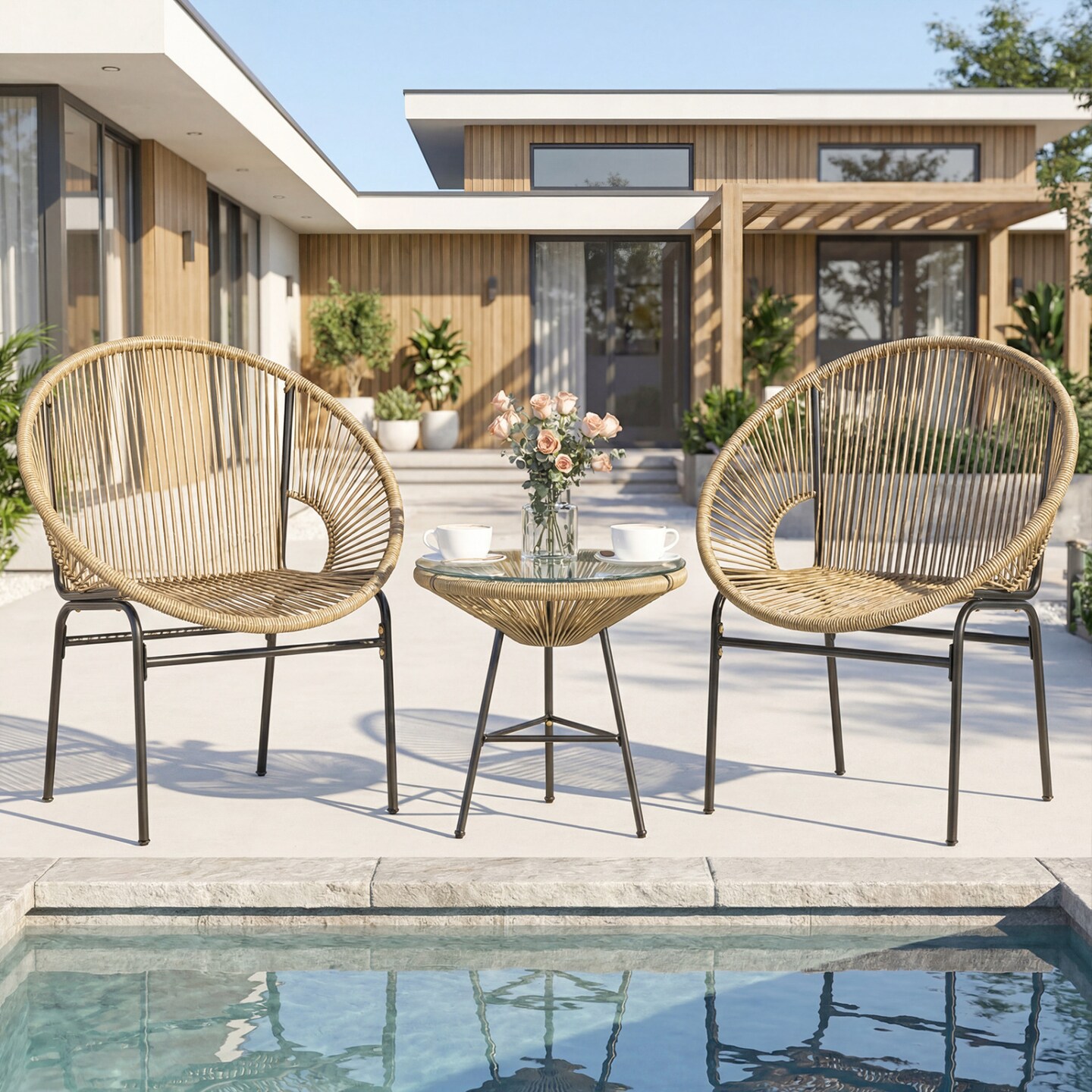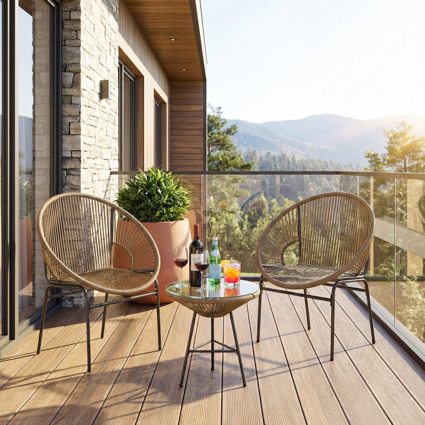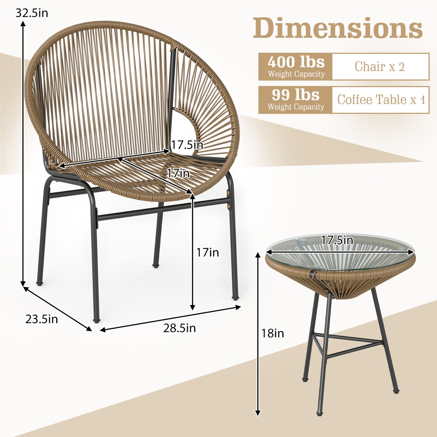 3 Pieces Brown Rope Patio Set with Chairs and Glass-Top Table Outdoor