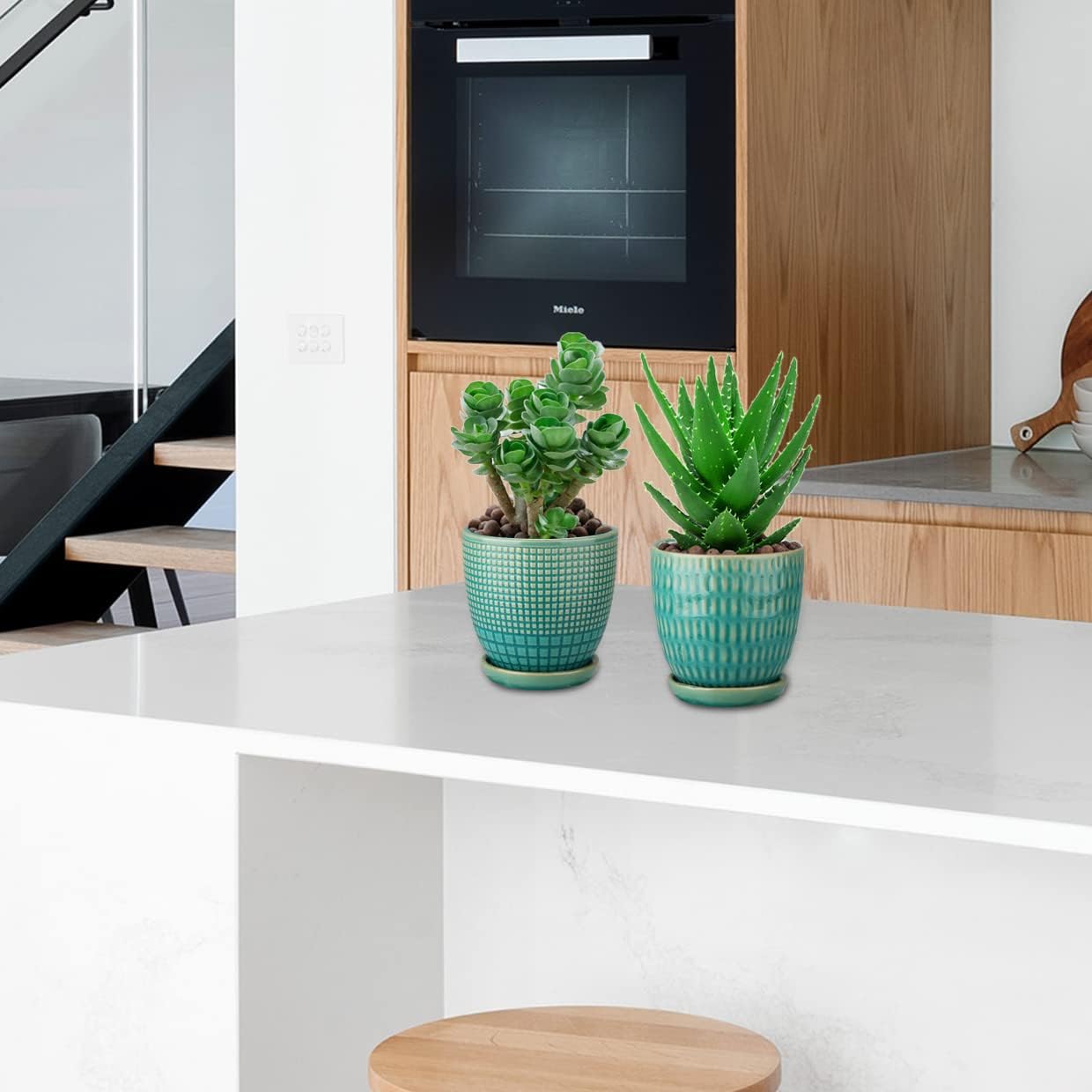 3 Set Ceramic Planters with Drainage Hole and Ceramic Tray Set (Teal)