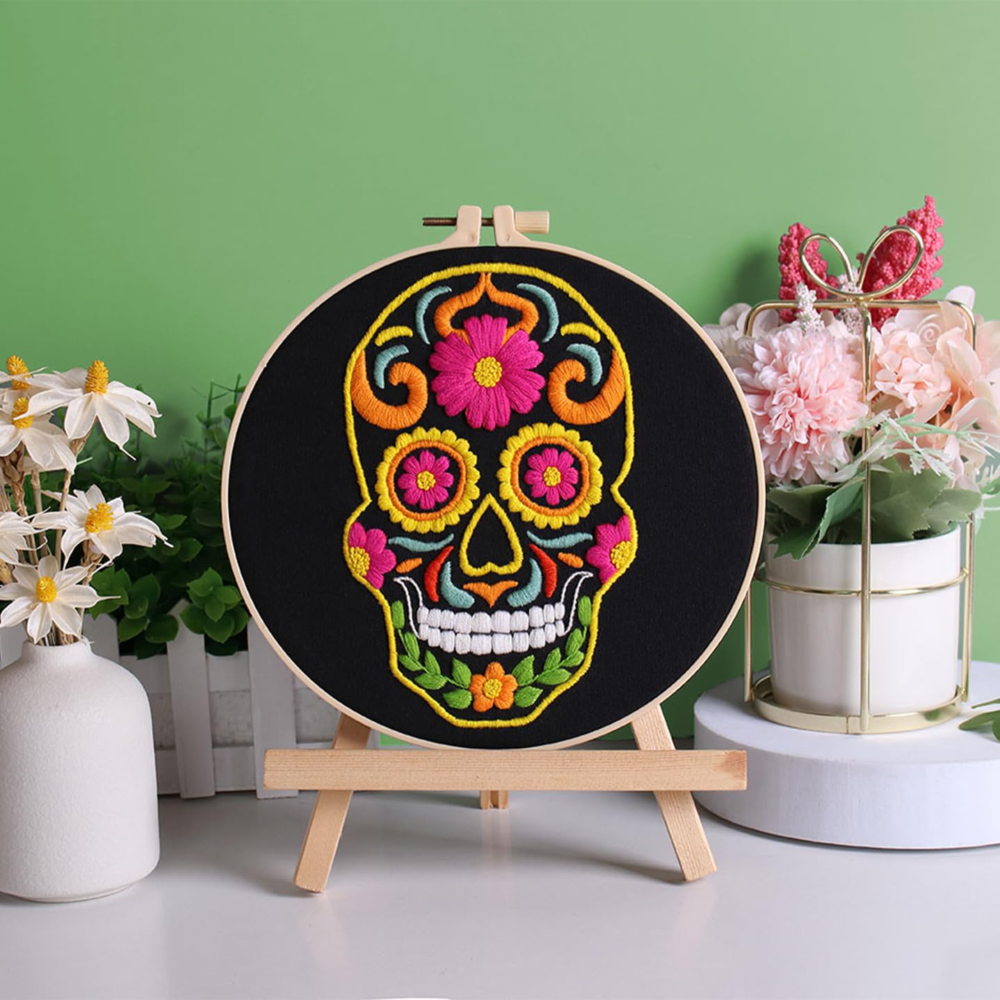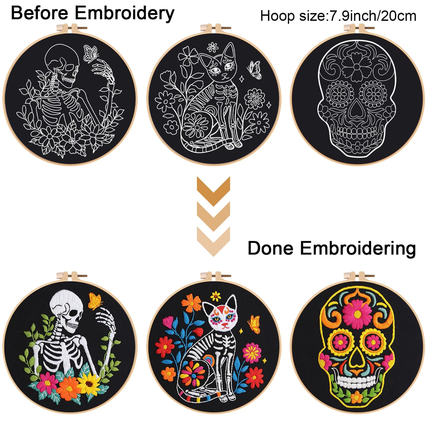 3 Sets Halloween Embroidery Kits for Beginners,Cross Stitch Kit for Adults,DIY Starters Needlepoint with Skull Flowers Pattern,Including Instruction