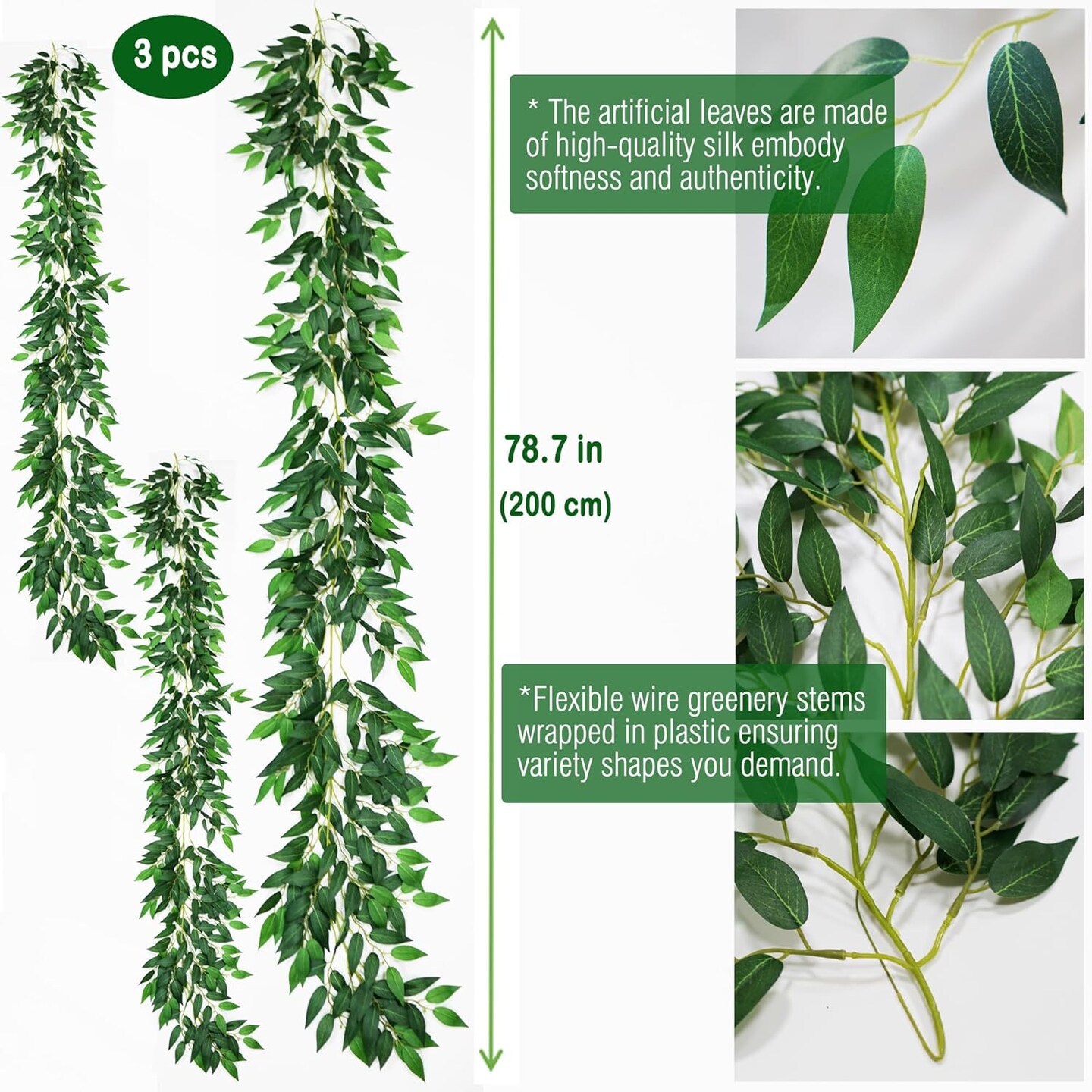 3 Strands Artificial Italian Ruscus Vines 78" Silk Italian Ruscus Greenery Garland with Green Leaves Faux Greenery Stems for Table Centerpieces Wedding Arch Flowers Home Decor