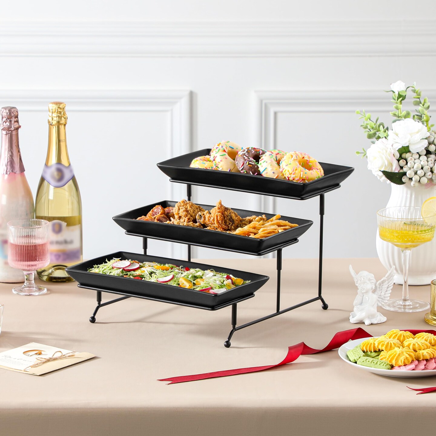 3 Tier Serving Tray, Porcelain Tiered Serving Trays Platters, 12 Inch Serving Stand with Platters,Black Dessert Stand with Collapsible Sturdier Metal Rack,Series PLAT