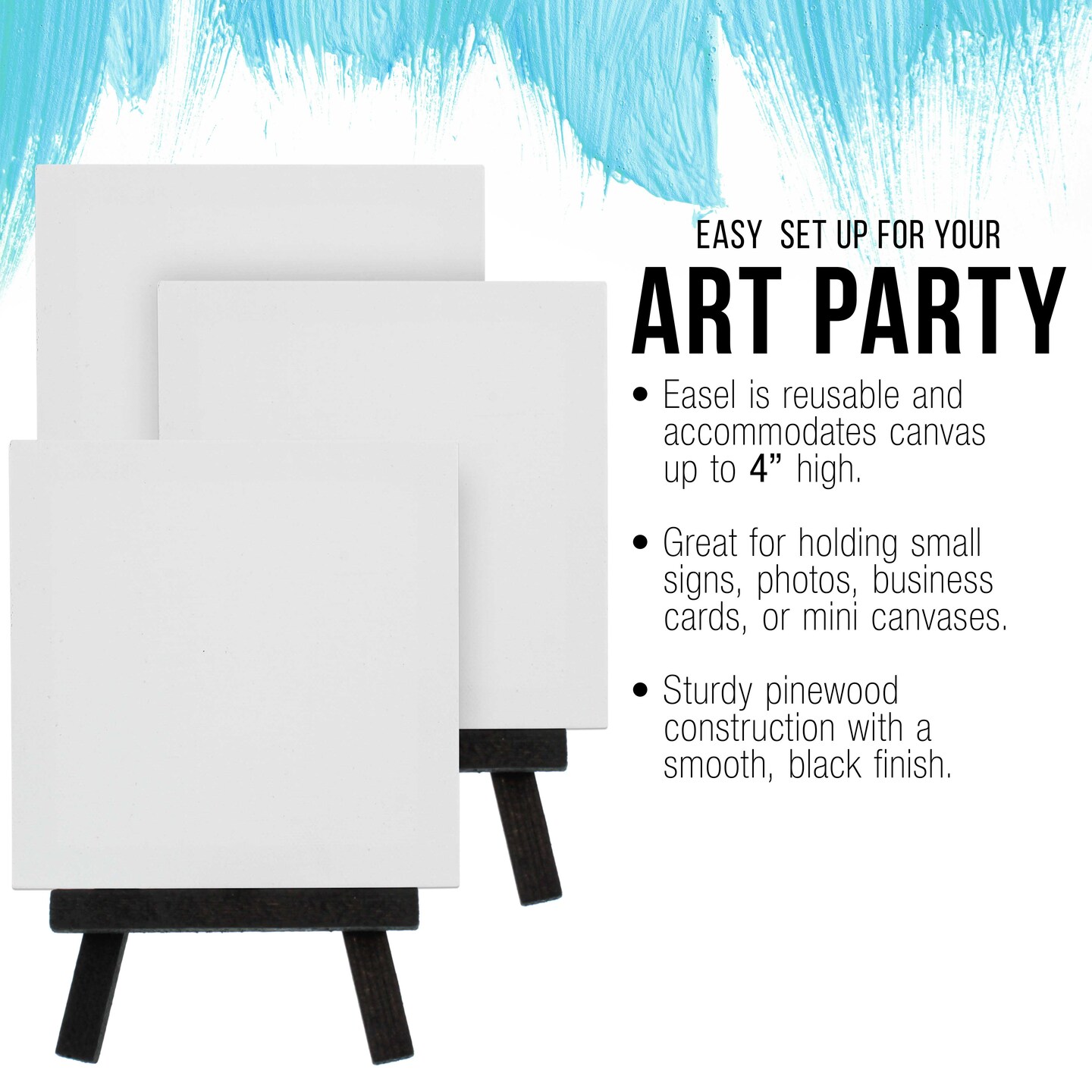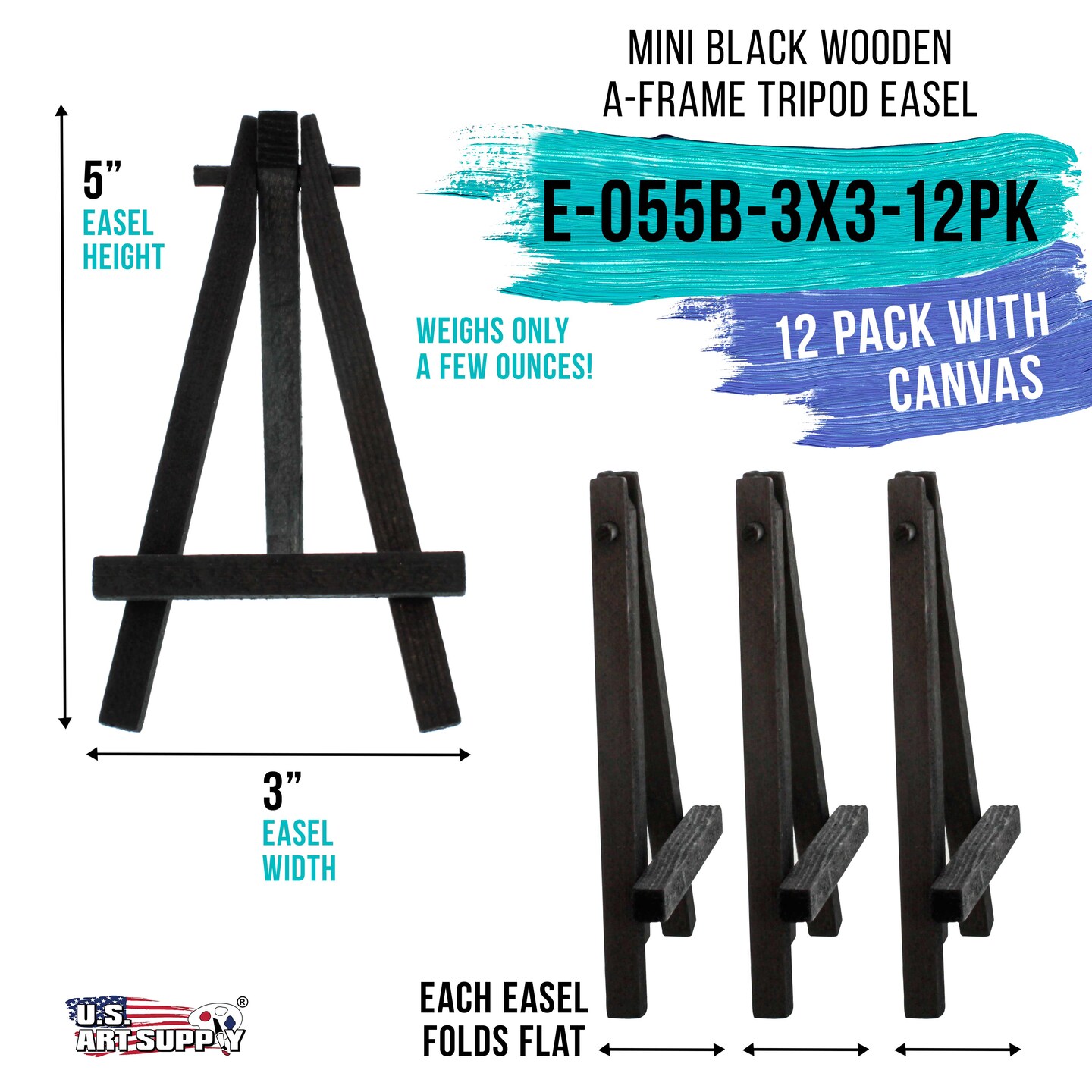 3" x 3" Stretched Canvas with 5" Mini Easel Kit (12 Pack) - Black Wooden A-Frame Tabletop Display Stand, Mini Easel Stand - Small Easels for Display, Small Canvases, Crafts, Photos