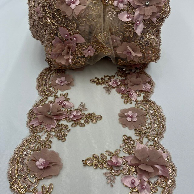 3 Yard Sequin 3D Lace Fabric 22.86 cm Wide Mesh with Pearls, Beads & Embroidery 100% Polyester