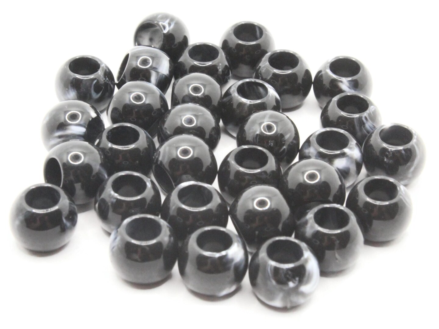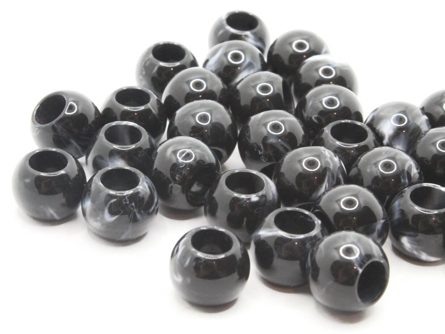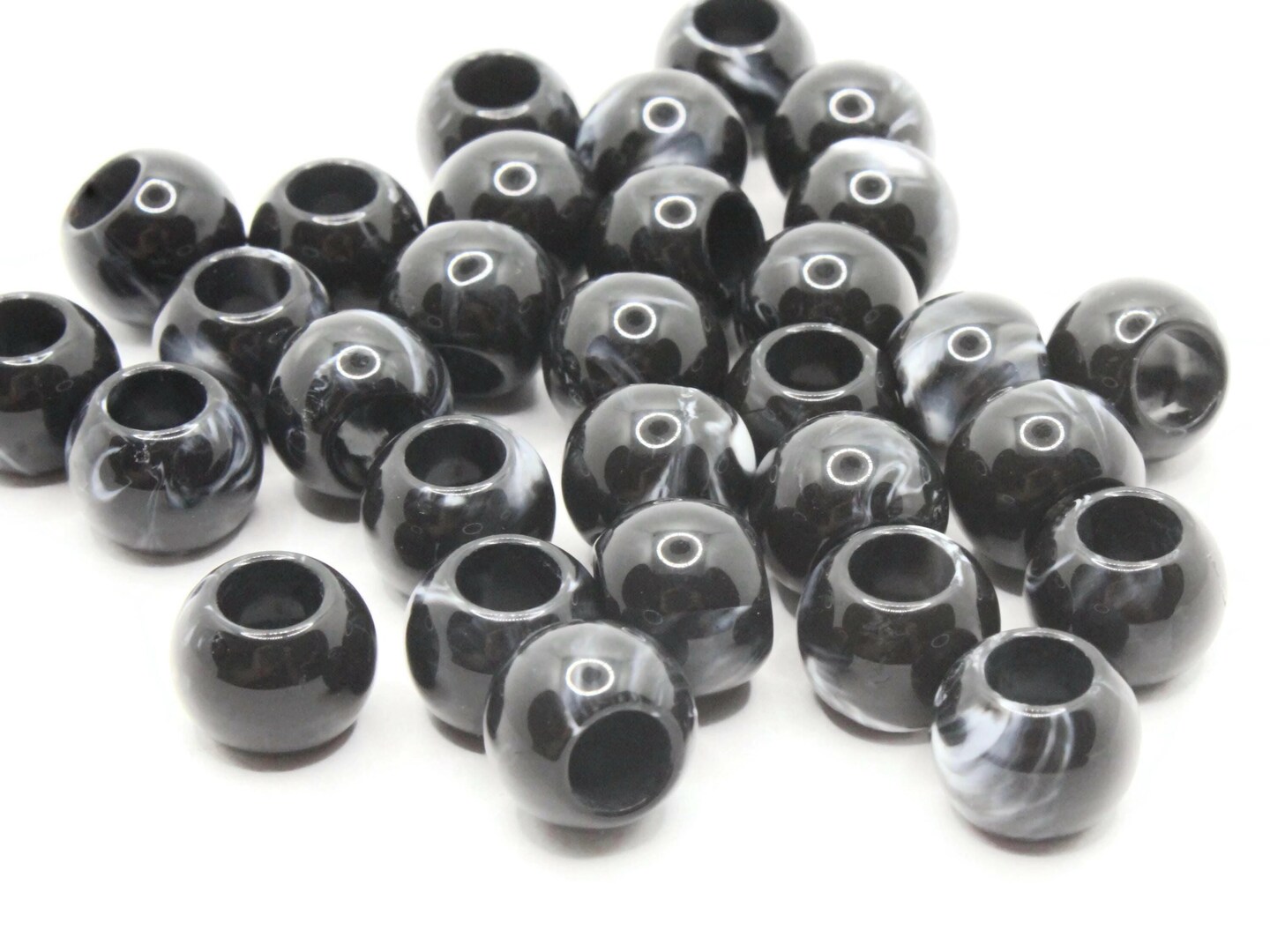 30 12mm Black and Gray Swirl Large Hole Round Plastic Beads