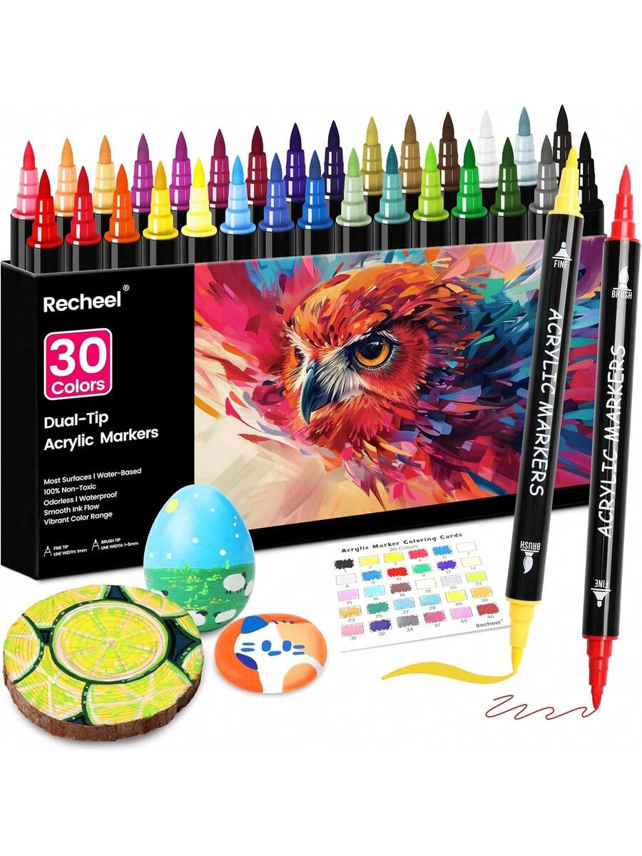 30 Colors Acrylic Paint Markers, Dual-Tip Fine and Brush Tips