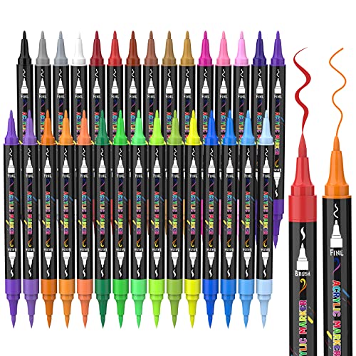 30 Colors Acrylic Paint Pens, Dual Tip Acrylic Paint Markers with Brush Tip and Fine Tip, Acrylic Markers for Rock Painting Wood Canvas Stone Glass Ceramic DIY Crafts Making Art Supplies Kids Adults