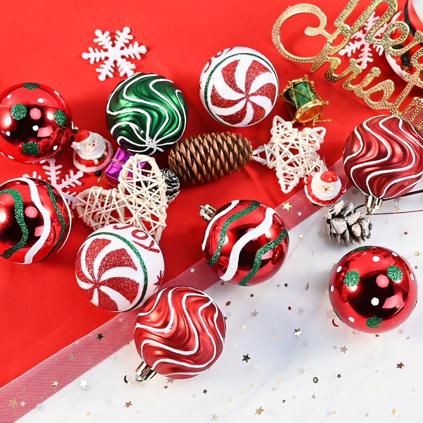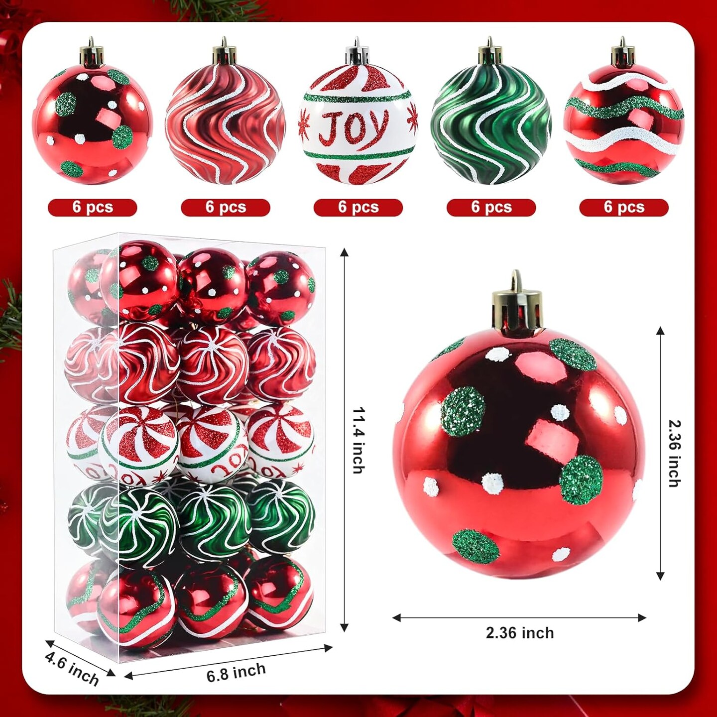 30 PCS Christmas Balls Ornaments, 2.36'' Red Green White Christmas Balls, Shatterproof Xmas Balls Decoration for Christmas Tree, Painting & Glittering Christmas Hanging Ball for Party Event
