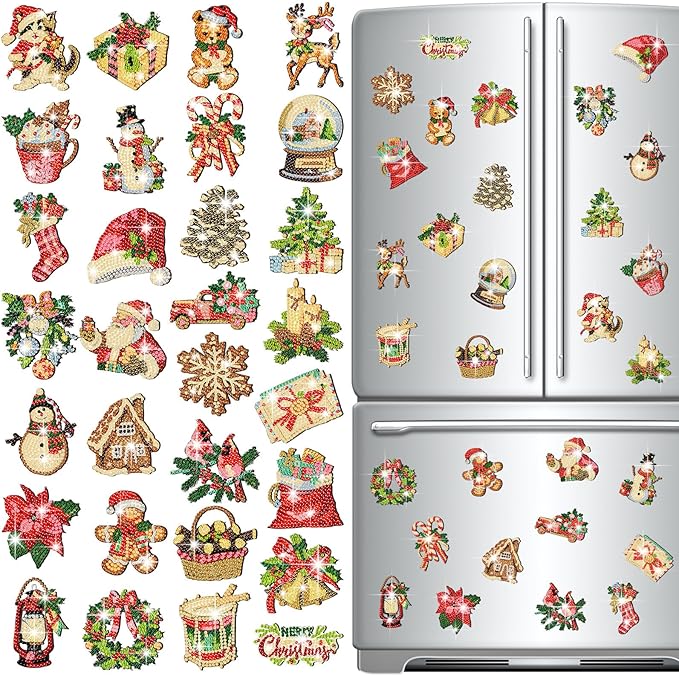 30 Pcs Christmas Diamond Painting Magnets for Refrigerator Santa Claus Diamond Art Painting Magnets Kits Fridge Diamond Art Stickers for Xmas DIY Home Decor