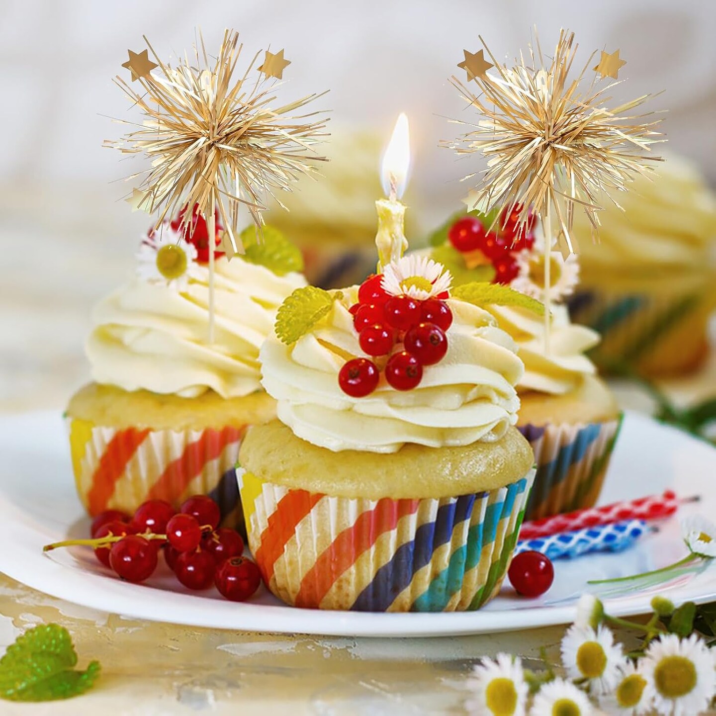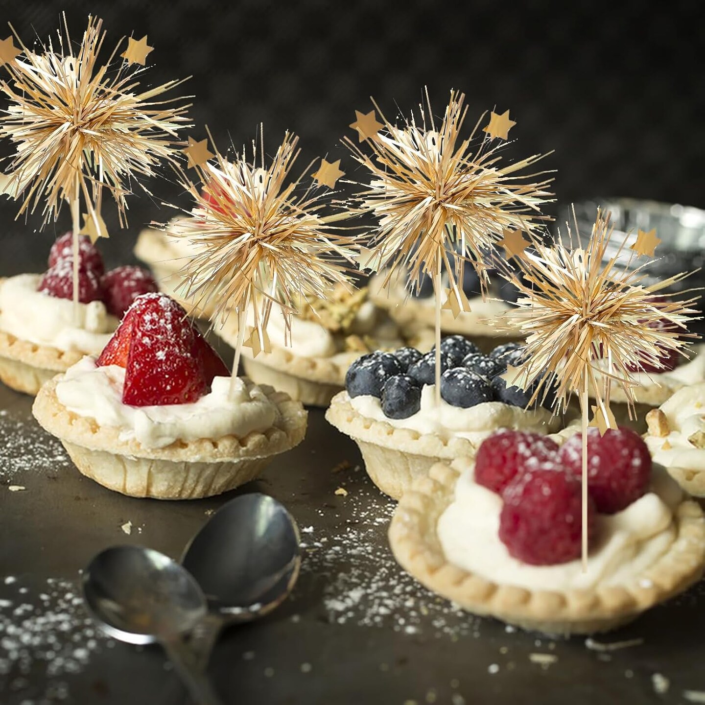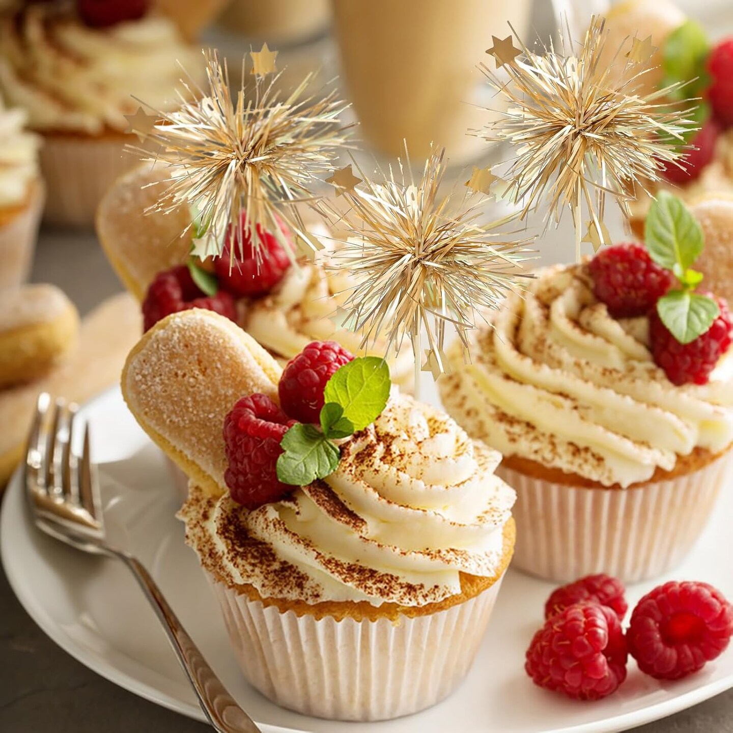 30 PCS Foil Fireworks Cupcake toppers, Happy Birthday Cake covers Parkling Tinsel Flowers Fruit Toothpicks, Birthday Party and Valentine's Day Party Supplies Gold
