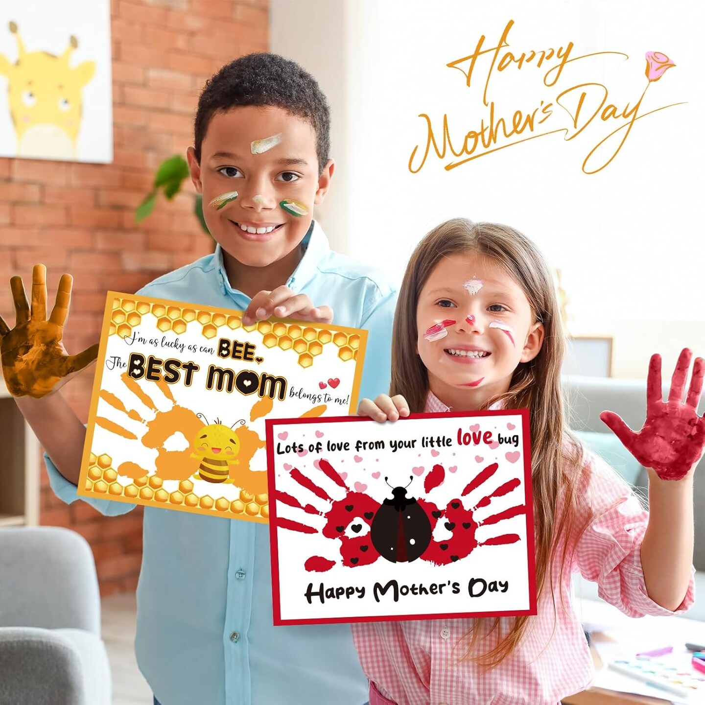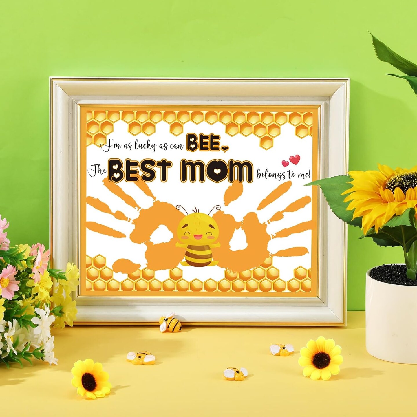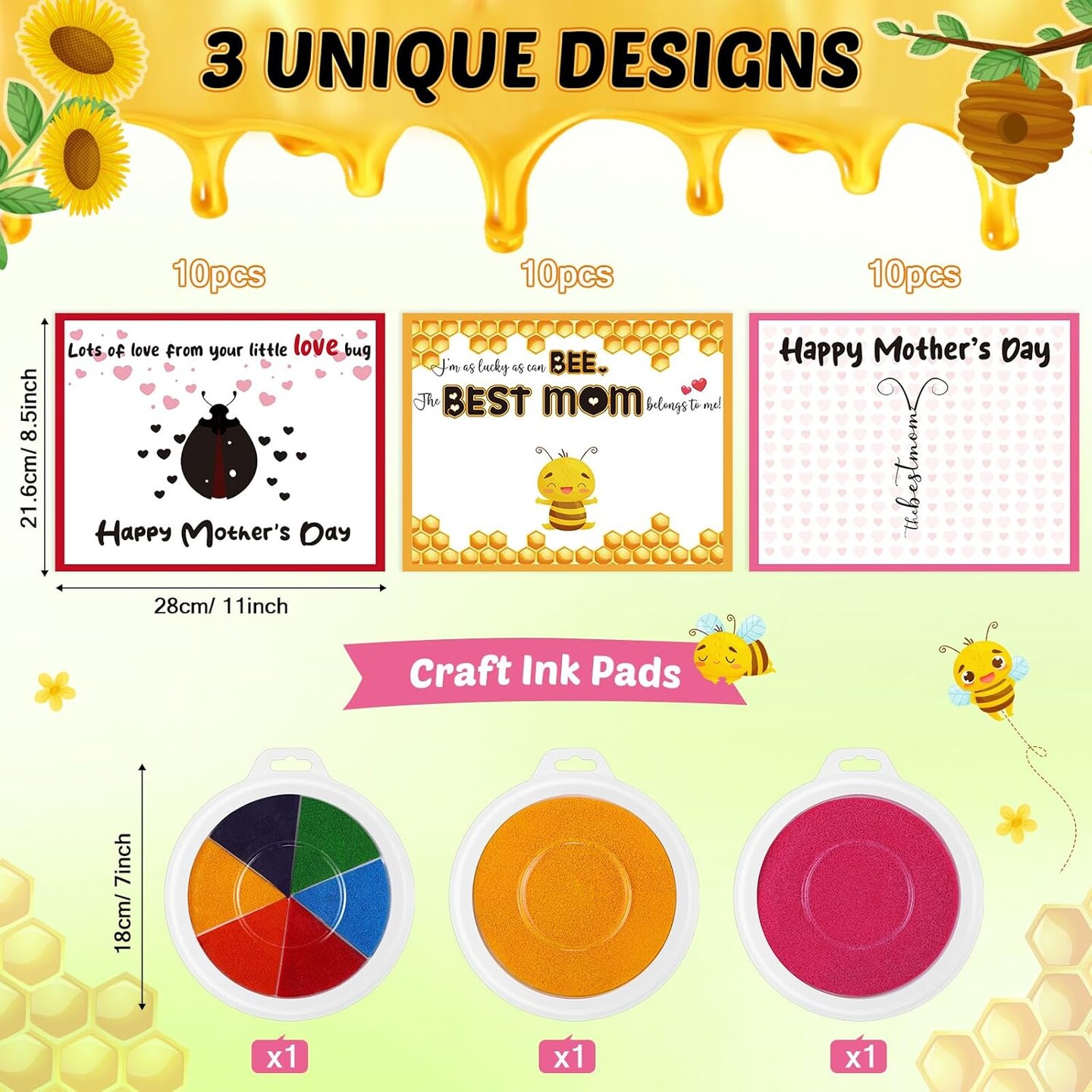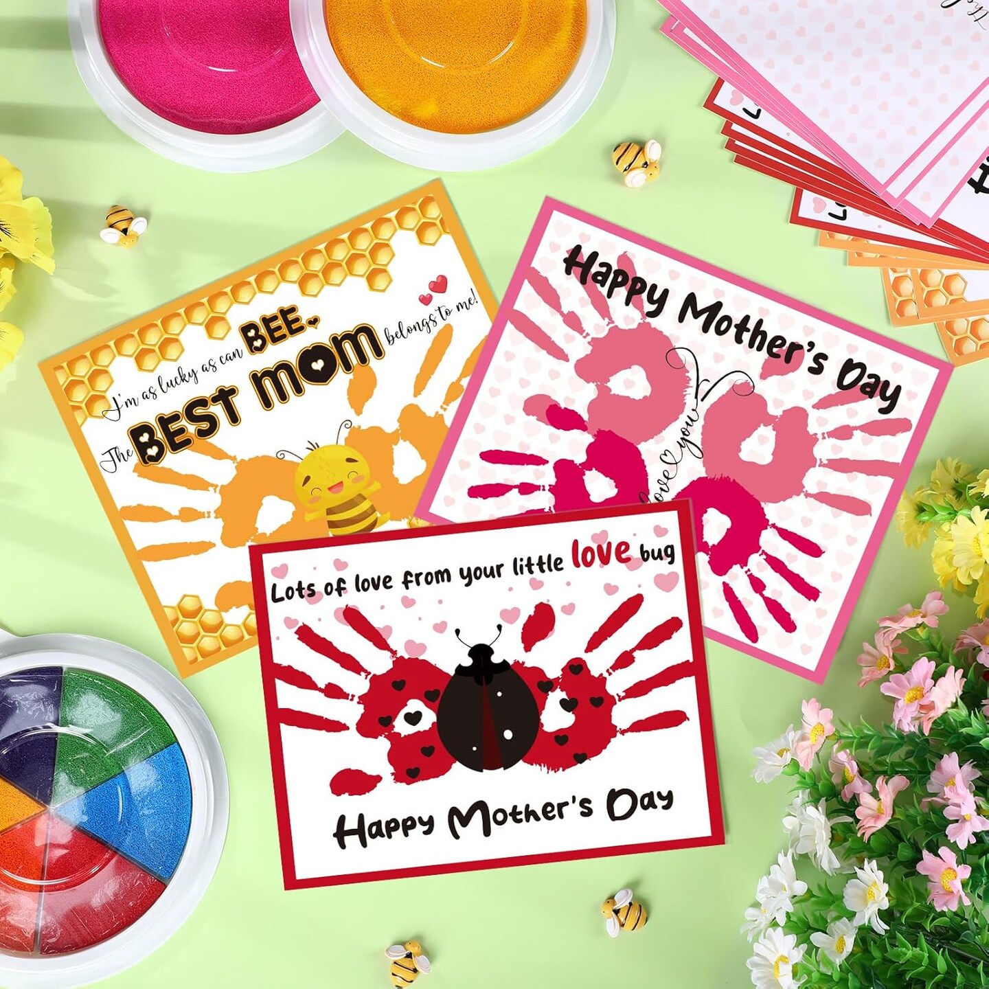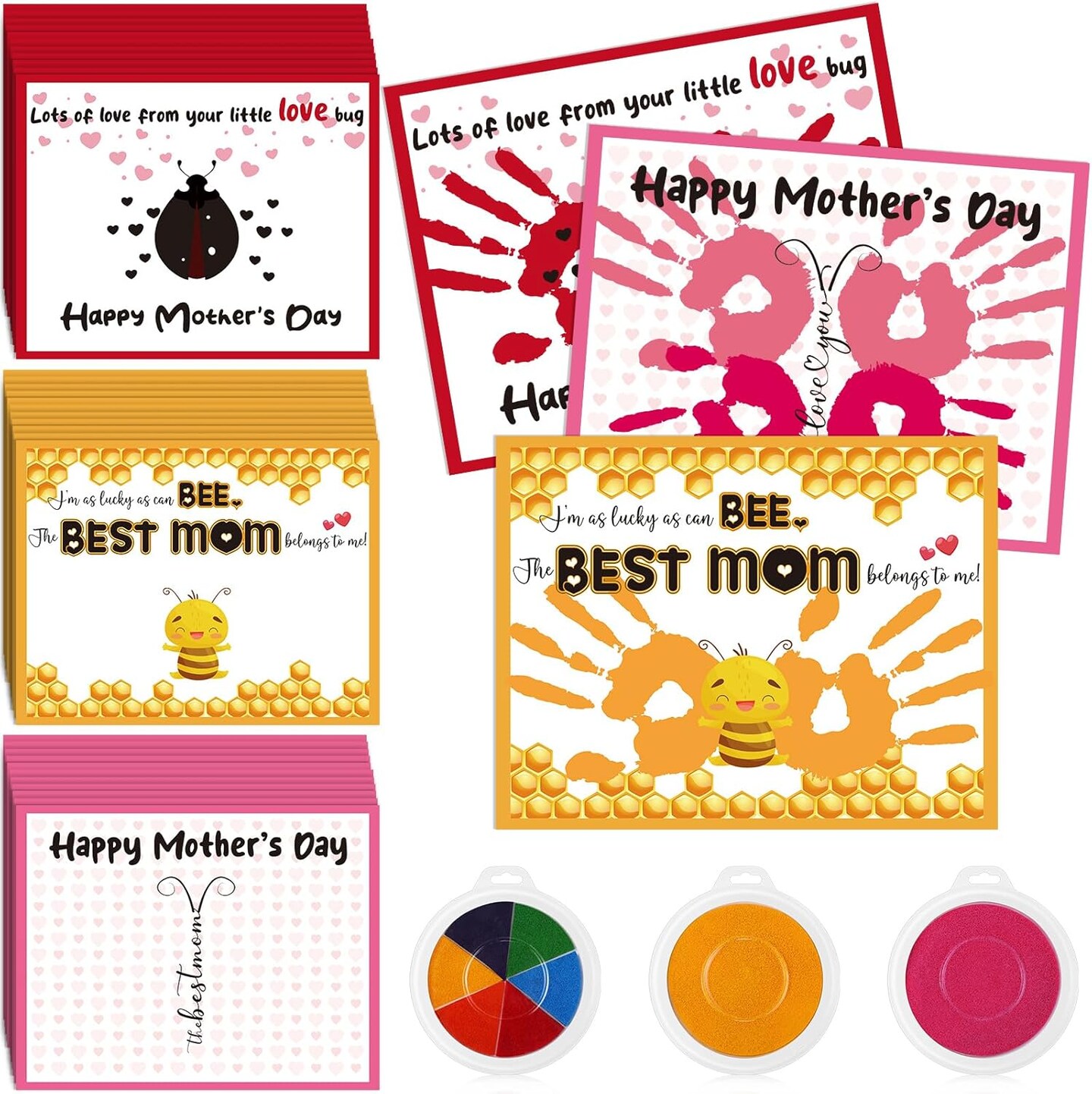 30 Pcs Mother's Day Handprint Craft Kits with 3 Large Ink Pads – DIY Greeting Cards for Mom, Sunday Home & Classroom Activities (Yellow, Bee)