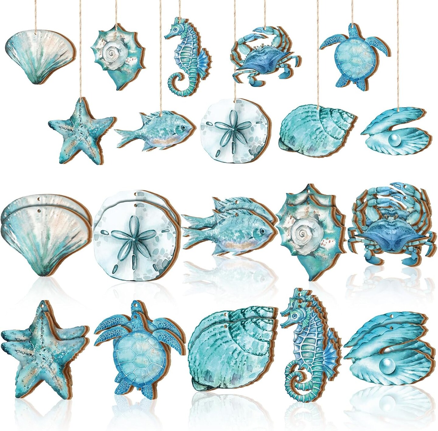 30 Pcs Summer Ocean Animals Ornaments Summer Ornaments for Tree Wooden Beach Hanging Ornaments Ocean Themed Ornaments with String Wooden Slices Summer Decor for Home Small Tree Party