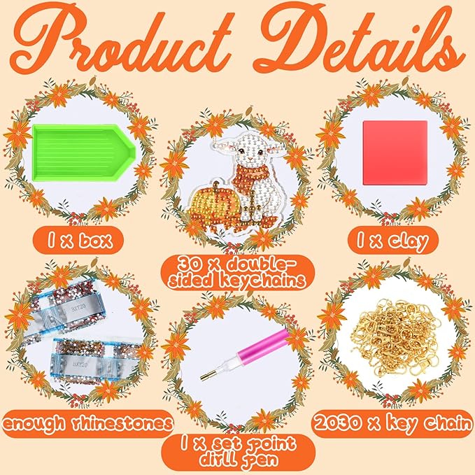 30 Pcs Thanksgiving Diamond Art Keychain Kits DIY Double Sided Thanksgiving Animals Diamond Painting Keychain Ornaments for Adults Key Ring Art Pendant Fall Tree Decor