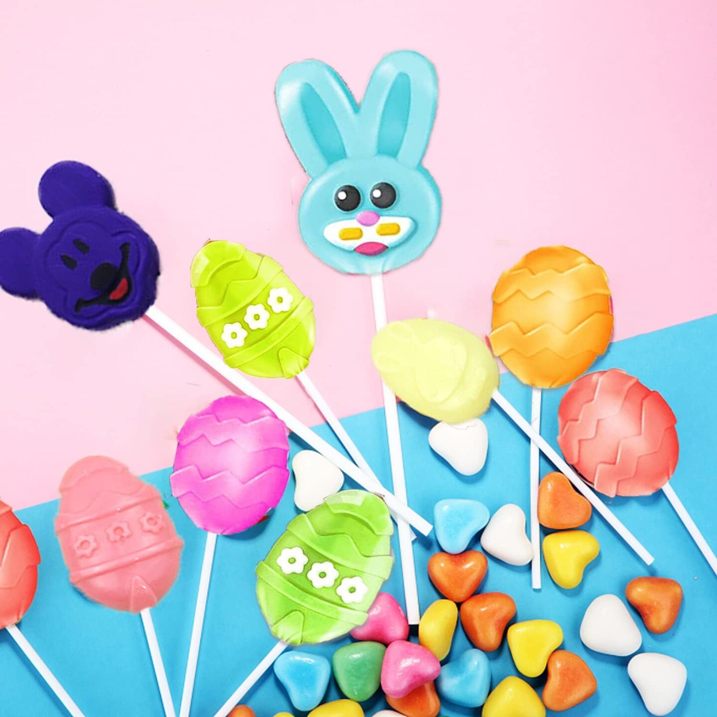 303Pcs Easter Lollipop Molds Set Easter Candy Mold Bunny Eggs Mouse Silicone Molds Rabbit Lolly Pop Tray Sucker Molds Hard Candy Mold Chocolate Baking Mold with Lollipop Sticks Treat Bags Twist Ties