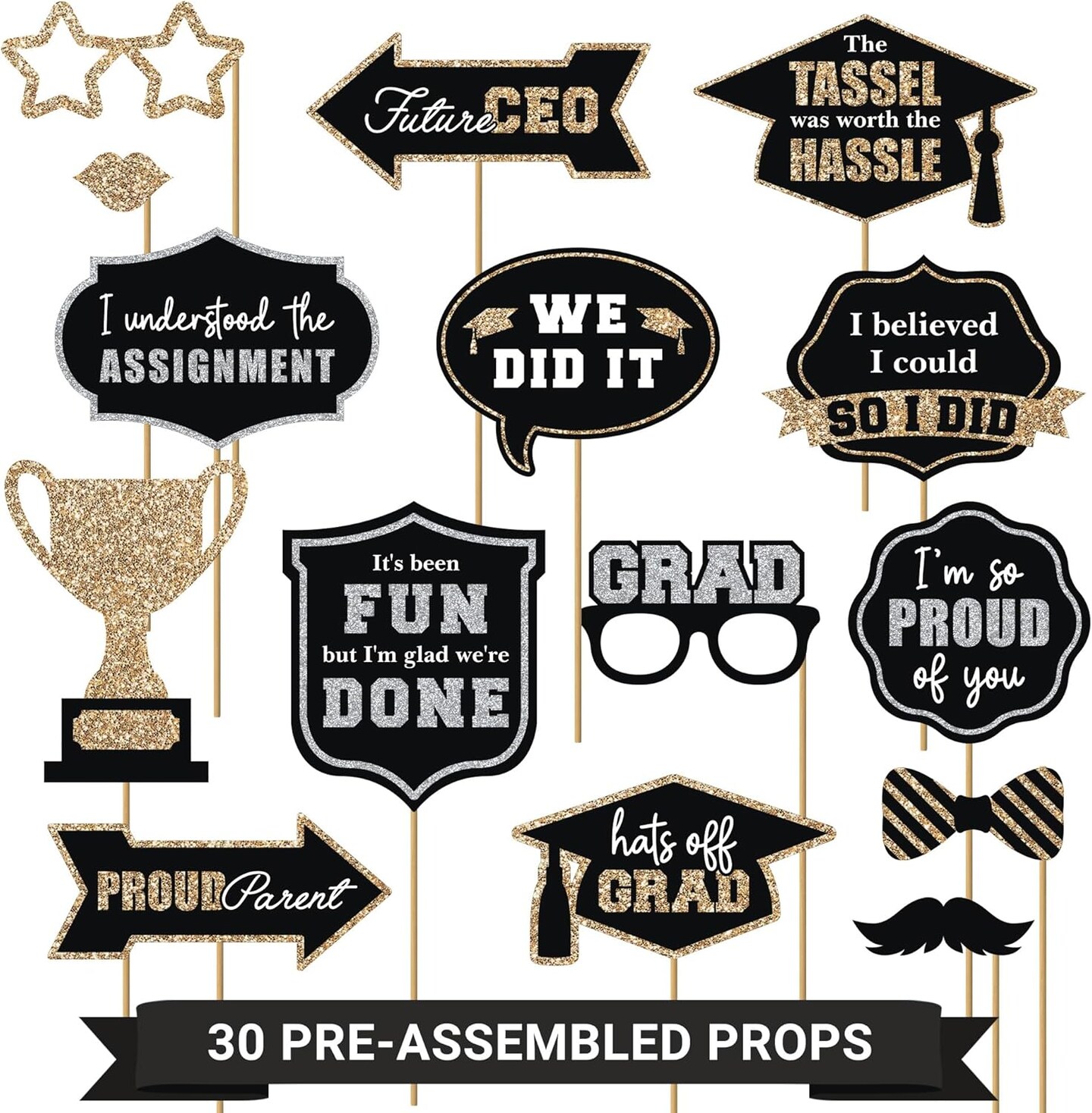 30PCS Fully Assembled Graduation Photo Booth Props – Class of 2026, Gold & Silver Glitter, No DIY