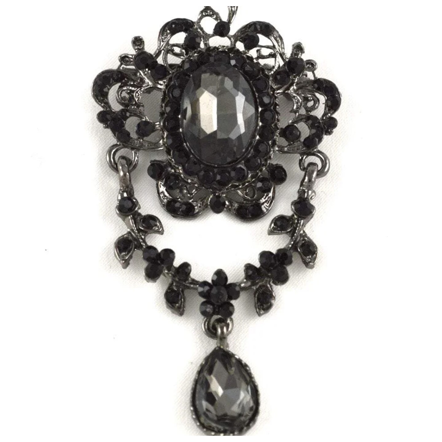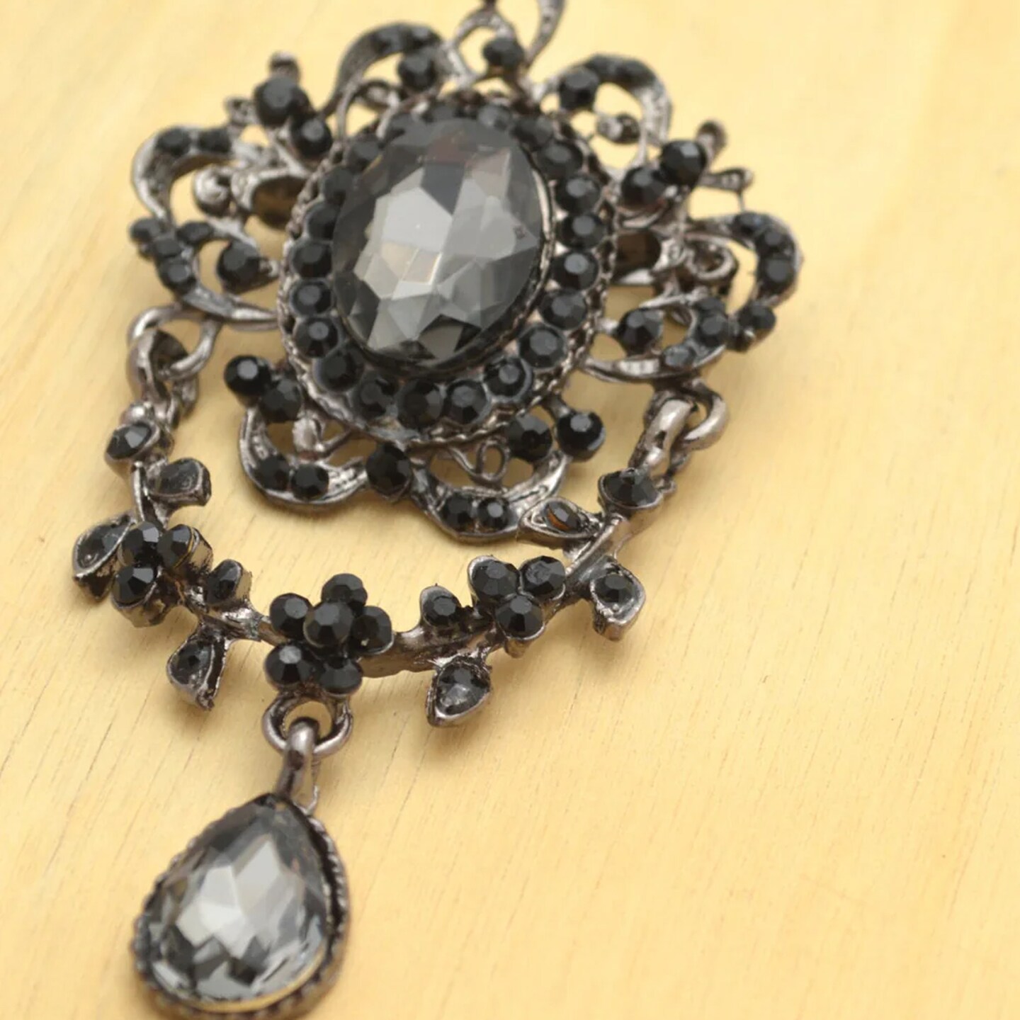 3.14" x 1.75" Gothic Black Dangling Brooch with Dark Rhinestones Vintage Jewelry