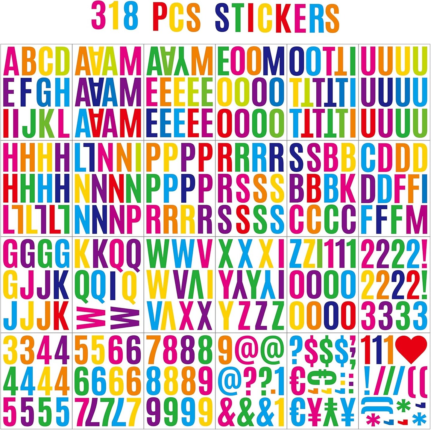 318Pcs 2inch Vinyl Letter & Numbers Stickers (Multi Color)
