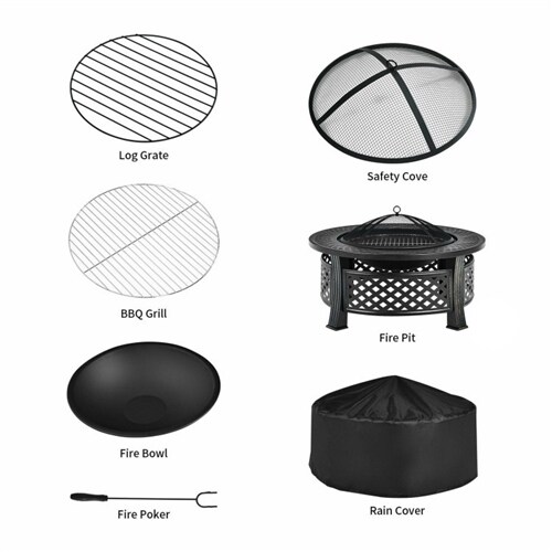 32 Inch Rustic Steel Outdoor Fire Pit with BBQ Grill Grate Mesh Spark Screen Fire Poker and Ash Pan for Patio Backyard Garden